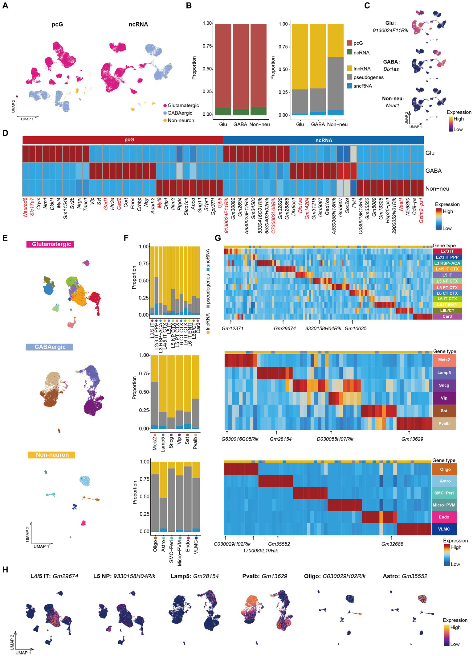 ncRNAs specifically expressed in Glu/GABA/Non-neu. (A) UMAP visualization of Glu, GABA and Non-neu using pcG (left) and ncRNA (right). (B) Stacked bar plots showing the proportion of differentially expressed (DE) gene type in Glu/GABA/Non-neu. Left, pcG and ncRNA. Right, ncRNA type including lncRNA, sncRNA and pseudogene. (C) UMAP visualization of ncRNAs specifically expressed in Glu, GABA, and Non-neu. (D) Heatmap showing the top DE pcGs and ncRNAs of each class. Known marker pcGs and ncRNAs shown in panel (C) and Supplementary Figure S2C are marked in red. (E) UMAP visualization of all cells clustered using ncRNA, colored by Glu cell type (top), GABA cell type (middle) and Non-neu cell type (bottom). (F) Stacked bar plots showing the proportion of DE ncRNA type in Glu cell type (top), GABA cell type (middle) and Non-neu cell type (bottom). (G) Heatmap showing the top DE ncRNA in Glu cell type (top), GABA cell type (middle) and Non-neu cell type (bottom). ncRNAs shown in panel (H) and Supplementary Figure S2I are marked. (H) UMAP visualization of ncRNAs specifically expressed in L4/5 IT, L5 NP, Lamp5, Pvalb, Oligo, and Astro.
