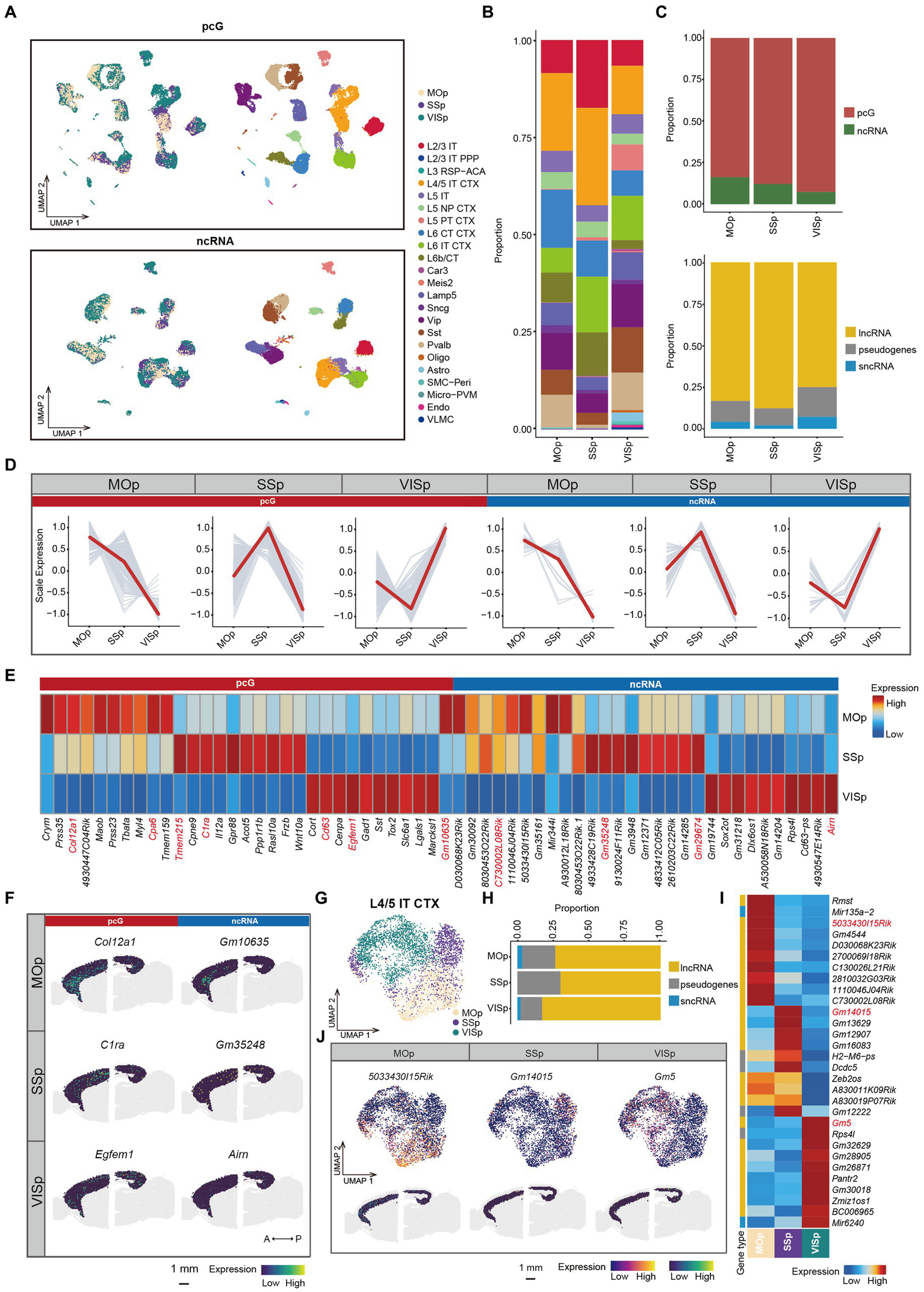 ncRNAs specifically expressed in different cortical areas. (A) UMAP visualization of all cells clustered using pcG (top) and ncRNA (bottom), colored by area (left) and cell type (right). (B) Stacked bar plots showing the proportion of different cell type in different areas. (C) Stacked bar plots showing the proportion of DE gene type in different areas. Top, pcG and ncRNA. Bottom, ncRNA type including lncRNA, sncRNA and pseudogenes. (D) Line plot showing area-specifically expressed pcGs and ncRNAs. Gray lines represent the expression dynamics of individual genes and the red line represents the average expression in different areas. (E) Heatmap showing the top DE pcGs and ncRNAs of each area. Genes shown in panel (F) and Supplementary Figure S4C are marked in red. (F) Spatial visualization of the area-specific pcGs and ncRNAs expressed in adult mouse cerebral cortex of 10x Visium ST data. Scale bar, 1 mm. (G–J) The ncRNA expression of L4/5 IT CTX is differently expressed in each area. (G) UMAP visualization of global clustering of L4/5 IT CTX, colored by area (SSp, MOp and VISp). (H) Stacked bar plots showing the proportion of DE ncRNA type in each area. (I) Heatmap showing the top DE ncRNAs in each area. (J) DE ncRNAs in each area of L4/5 IT CTX. Top, UMAP visualization of ncRNA specifically expressed in MOp, SSp and VISp. Bottom, Spatial visualization of the area -specific ncRNA expressed in adult mouse cerebral cortex of L6. Scale bar, 1 mm.