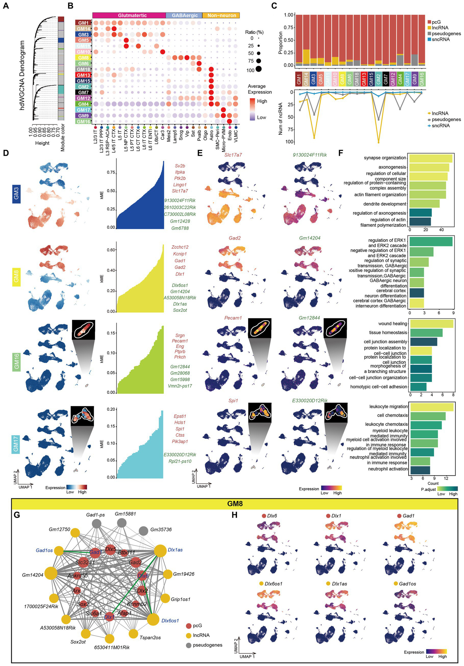 Co-expression networks analysis of mouse cerebral cortex. (A) Hierarchical cluster tree showing modules of co-expressed genes identified by hdWGCNA. A total of 18 co-expressed gene modules (GMs) were found and were represented by branches and labeled by different colors to the bottom of the tree. The height (y-axis) indicates levels of correlation. (B) Bubble plot showing the expression ratio and average expression value of genes in different GMs in each cell type. The color of each bubble indicates the average expression level, and the size indicates the proportion of expressing cells. (C) Top, stacked bar plots showing the proportion of gene type in each module. Bottom, line plot showing the number of different types of ncRNA in each module. (D) Left, UMAP visualization of average expression level of genes in GM3, GM8, GM16 and GM17. Right: At most top 5 pcGs (red) and ncRNAs (green) in GM3, GM8, GM16 and GM17, ranked by eigengene-based connectivity (kME). (E) UMAP visualization of representative pcG and ncRNA in GM3, GM8, GM16 and GM17. (F) The bar plot showing the representative gene-ontology (GO) pathways enriched with genes from GM3, GM8, GM16 and GM17, with the color intensity representing the magnitude of the p.adjust value. The x-axis represents the number of genes enriched in the pathway, and the y-axis represents the name of the enriched pathway. (G) The co-expression network showing the interactions between genes in GM8. Nodes represent genes, and edges represent co-expression links. The width of the edges represents the magnitude of the correlation between genes. The size of the nodes represents the number of genes that are mutually associated with that gene. The color of the nodes represents different gene types (pcG: red, lncRNA: yellow, sncRNA: blue, Pseudogenes: gray). The green line represents the connection between sense-antisense gene pairs. (H) UMAP visualization of representative pcGs and ncRNAs in GM8.