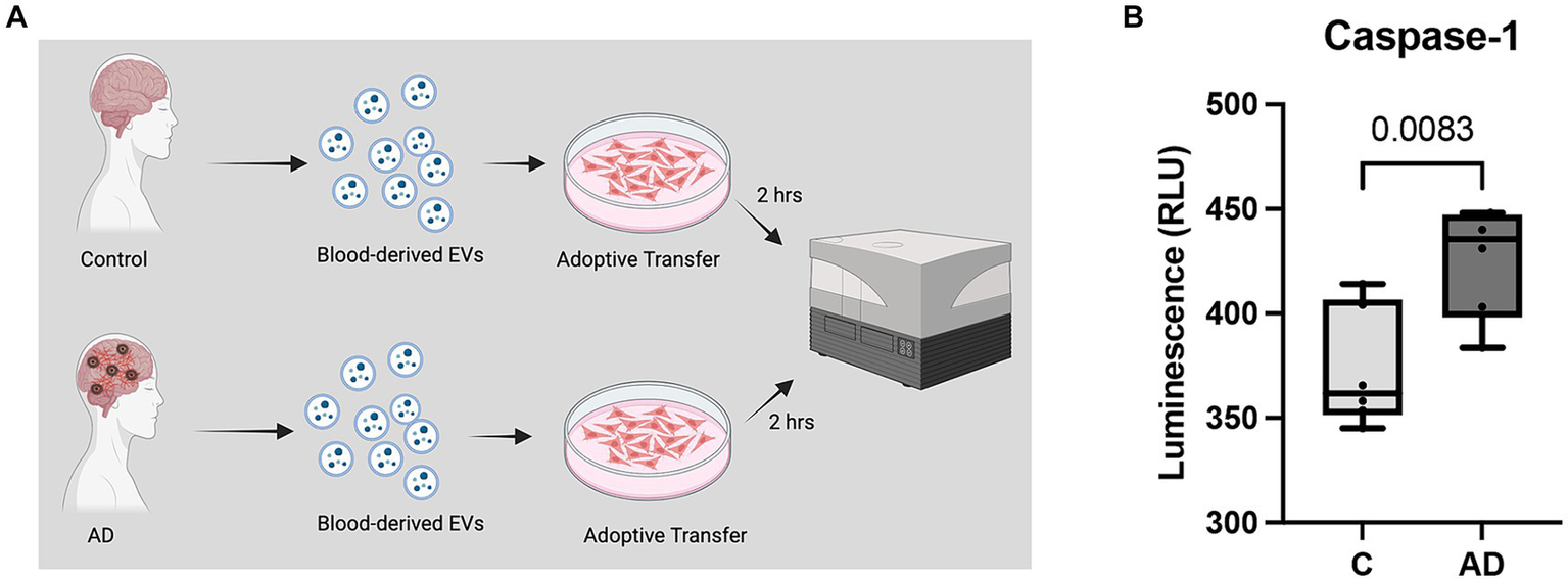 Adoptive transfer of EV from AD and healthy controls was completed in T/G HA-VSMC human cardiovascular cells (American Type Culture Collection (ATCC)). Cells were cultured with Smooth Muscle Cell Growth Medium (Cell Applications, San Diego, CA, United States) supplemented with 10% fetal bovine serum (FBS) (GeminiBio). Cells were grown in a T-75 flask until 70% confluency, after which they were transferred to a 24-well plate (~4.3×107 particles/mL) as in (Keane et al., 2023). Media was aspirated and replaced by 1 mL of isolated EV resuspended in Smooth Muscle Cell Growth Medium; cells were then placed in an incubator at 37o C for 2 h and the cell medium was harvested after termination of EV exposure. Caspase activity in the cell medium was assessed as per manufacturer instructions using the Caspase-Glo® 1 Inflammasome Assay (Promega, Madison, WI, United States). Luminometry was quantified in the SPARK 10 M (TECAN) spectrophotometer.