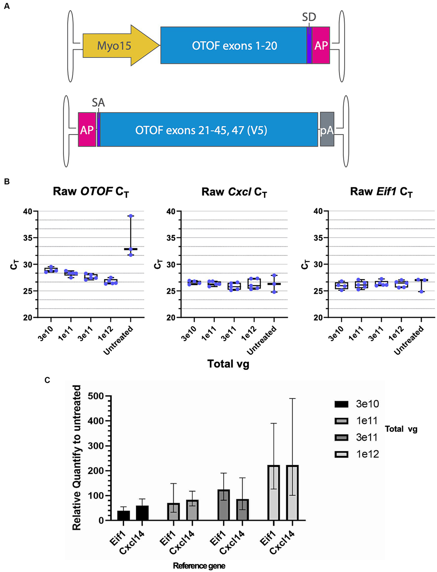 OTOF over-expression by AAV dose-dependently increases the OTOF RNA expression in the utricles. (A) Vector design of the dual vectors of DB-OTO. (top: 5′ vector; bottom: 3′ vector). (B) Real-time quantitative PCR was performed with cultured utricles with various doses of DB-OTO (C57BL6/J; n = 5 utricles, 3 animals per dose group) to quantify the OTOF RNA expression. Raw CT values and box plots (median, quartiles, and range) for OTOF (left), Cxcl14 (middle, hair cell reference gene) and Eif1 (right, widely expressed reference gene) are plotted. Each dot represents one utricle and the average of two technical duplicates. (C) Relative quantify of OTOF expression in all 4 treated groups compared with untreated group. Error bars are calculated from 95% CI of ΔΔCT. See Supplementary Tables S1 and S2 for more details and statistics.