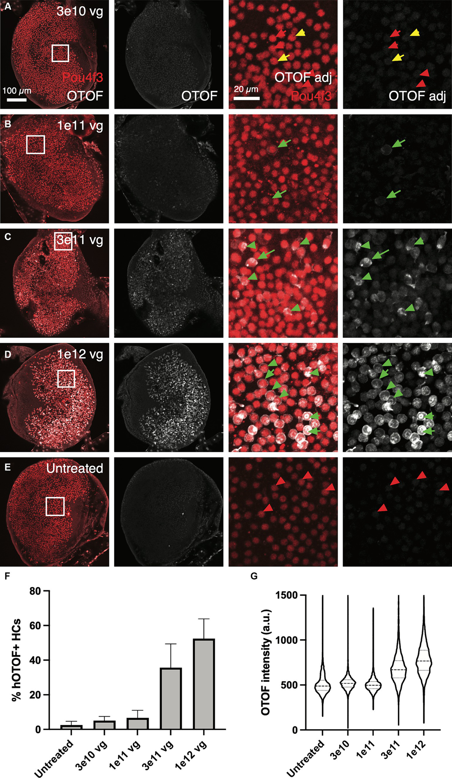 OTOF protein expression dose-dependently increased with AAV dose. AAVs encoding the 5′ and 3′ of the OTOF gene were delivered to the adult utricles from OtofQ828X/Q828X mice (n = 4–5 utricles, 3 animals per dose group) (A–D) and cultured for 14 days at 1:1 ratio with various doses of DB-OTO. The OTOF protein was labeled with antibodies. Some utricles were cultured untreated as negative IHC control (E). First panel, OTOF protein signal overlaid with hair cells in utricles. Second panel, OTOF protein signal at various doses. OTOF was imaged with the same acquisition settings. Panels 3–4, zoom in view of OTOF expression in a small region of the utricle as shown in the square in first panel. Otof display is adjusted to show lack of signal in low-dose groups. Green arrow, OTOF-positive hair cells; red arrow, OTOF-negative hair cells; yellow arrow, possible OTOF-positive hair cells but with weak OTOF signals. (F,G) Quantification of the OTOF protein signal in hair cells. (F) The percentage of hair cells that are OTOF+ (mean ± S.D.). (G) Violin plots depicting the median (thick dashed lines) and quartiles (thin dashed lines) of OTOF intensity in absolute units (a.u., range 0–4,095 from 12-bit images) in OTOF-positive hair cells.