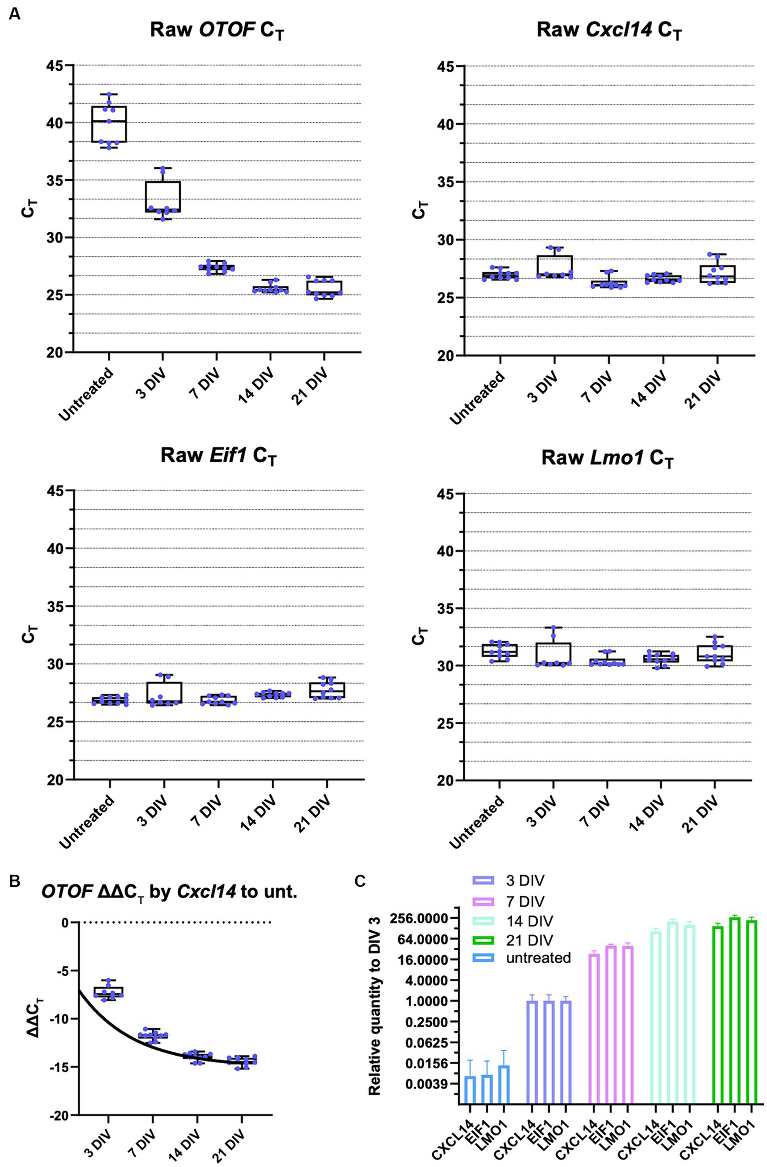 OTOF expression increases as the culture time and AAV expression time increases. RT-qPCR was performed using individual utricles (C57BL6/J; n = 5 biological replicates (utricles from 3 animals), two RT-qPCR technical replicates) treated with 5e11 vg of DB-OTO and cultured for 3, 7, 14, or 21 days. Each dot represents one technical replicate. (A) Raw CT values and box plots (median, quartiles, and range) for various durations are plotted. Cxcl14 and Lmo1 are hair cell markers, Eif1 is a widely expressed gene. (B)OTOF ΔΔCT. to untreated group normalized by Cxcl14 and fit to an exponential plateau function. (C) Relative expression quantify at various days compared with untreated utricles.