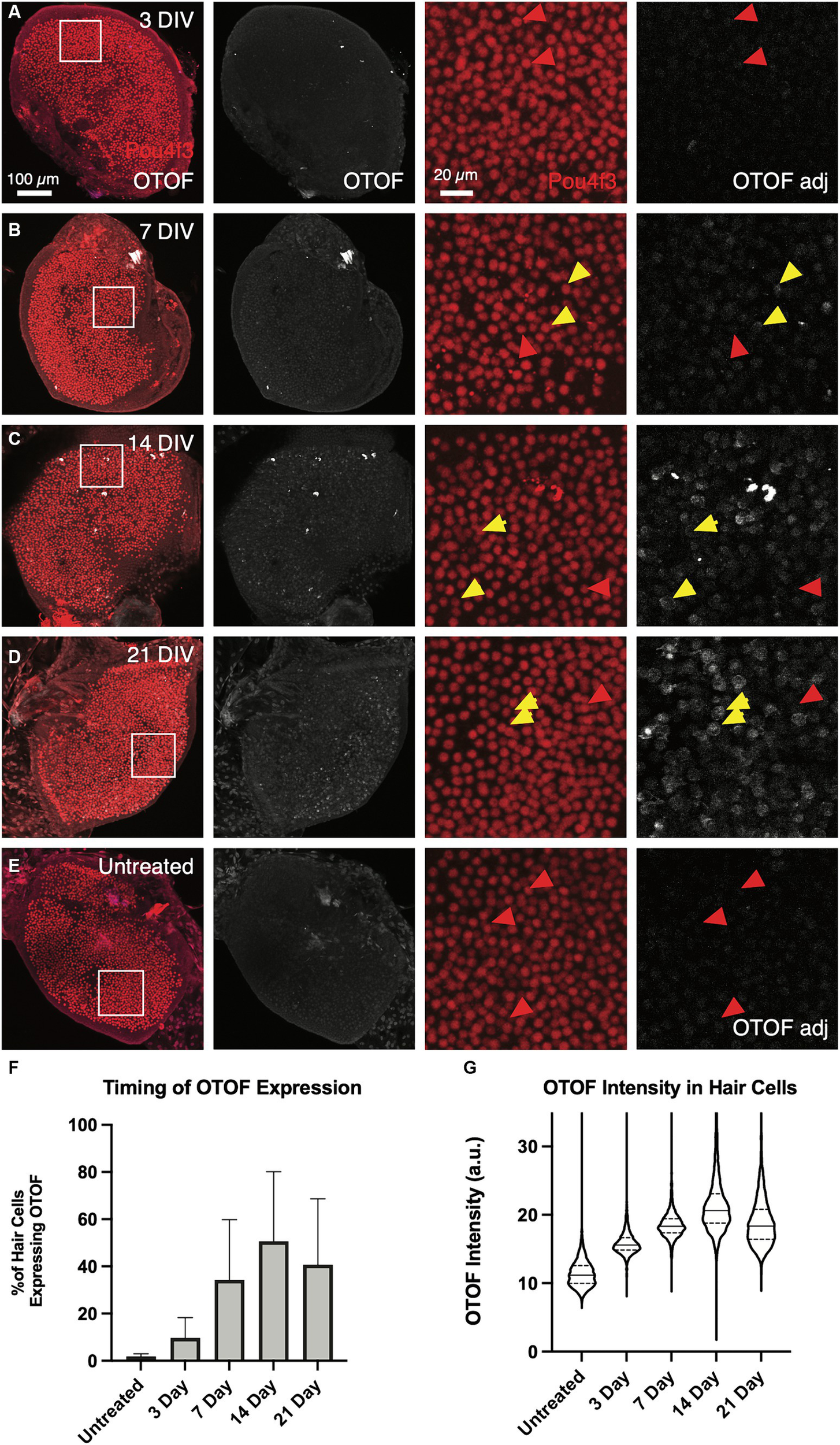 OTOF protein expression increases as the culture time increases. Adult utricles from OtofQ828X/Q828X mice (n = 5 utricles, 3 animals per dose group) were treated with 5e11 vg DB-OTO and cultured for 3–21 days. The expression level of OTOF was analyzed (A–D). As a negative control, utricles from Otof mutant mice were not treated but cultured for a total of 21 days (E) Columns 1–2: Overview of hair cells and OTOF expression in the whole utricle. Columns 3–4: A small region of the utricle (as shown in first column) is shown, highlighting the OTOF expression in the hair cells. Yellow arrow, OTOF+ hair cells; red arrow, HCs that are OTOF–. (F) The percentage of hair cells that are OTOF+ (mean ± S.D.). (G) Violin plots depicting the median (thick dashed lines) and quartiles (thin dashed lines) of OTOF intensity in absolute units (a.u., range 0–255 from 8-bit images) in OTOF-positive hair cells.