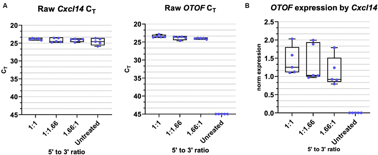 OTOF full length RNA with varied 5′ and 3′ vector ratios. (A) Real-time quantitative PCR was performed with cultured utricles (C57BL6/J; n = 5 biological replicates (utricles from 3 animals)) to quantify the OTOF RNA expression with different ratios of the 5′ and 3’ DB-OTO vectors. All dosing groups were cultured with the same 5e11 total vgs of DB-OTO. Raw CT values and box plots (median, quartiles, and range) for OTOF (left) and Cxcl14 (middle, hair cell reference gene) are plotted. Each dot represents one utricle and the average of two technical duplicates. (B) Full length OTOF expression normalized by hair cell control gene Cxcl14 in all treated groups.