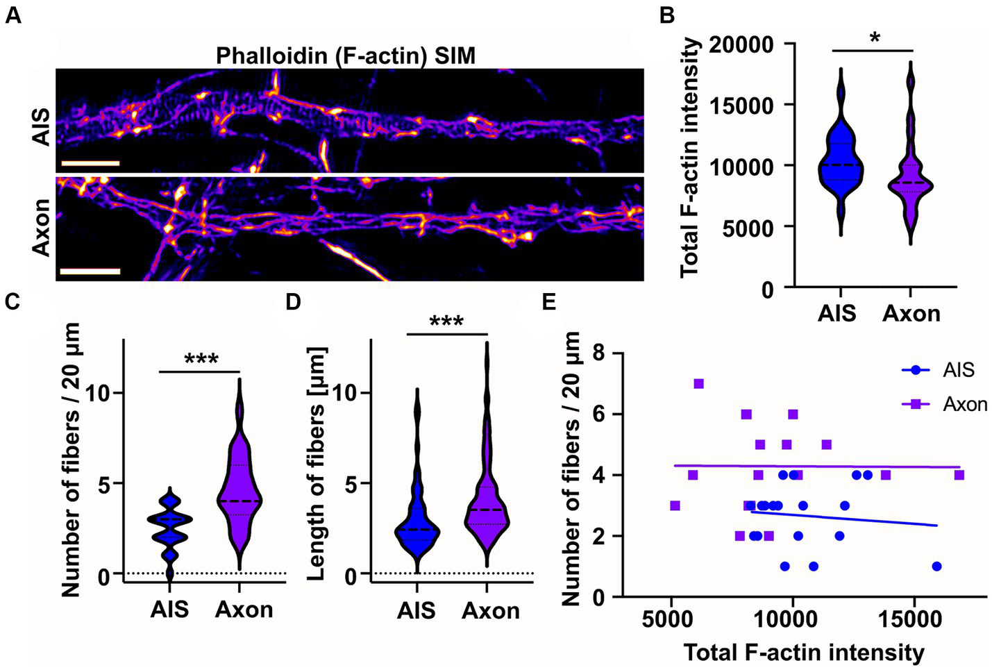 From earlier literature we knew that longitudinal actin fibers are present in dendrites and now we have observed them in the AIS. However, there is no direct information on whether longitudinal actin fibers are also present in distal axons. Therefore, in addition to the AIS, we imaged areas from distal axons beyond ankyrinG staining. This approach revealed that there are longitudinal actin fibers also in distal axons (Figure 3A). To test whether intensity of phalloidin staining is comparable in the images taken from the AIS and distal axon, we measured the total F-actin intensity of SIM images. The average F-actin intensities were slightly higher in AIS images compared to distal axon images (Figure 3B). We then measured the number and length of longitudinal actin fibers in the AIS and distal axon and found that there are more longitudinal actin fibers in the distal axons than in the AIS in control conditions (Figure 3C). Longitudinal actin fibers were also 1 μm longer in distal axons compared to AIS area (Figure 3D). To test whether the number of longitudinal actin fibers depends on the general brightness of imaged filamentous actin, we analyzed whether there is any correlation between the total F-actin intensity (Figure 3B) and number of longitudinal actin fibers (Figure 3C), but there was no such correlation (Figure 3E).