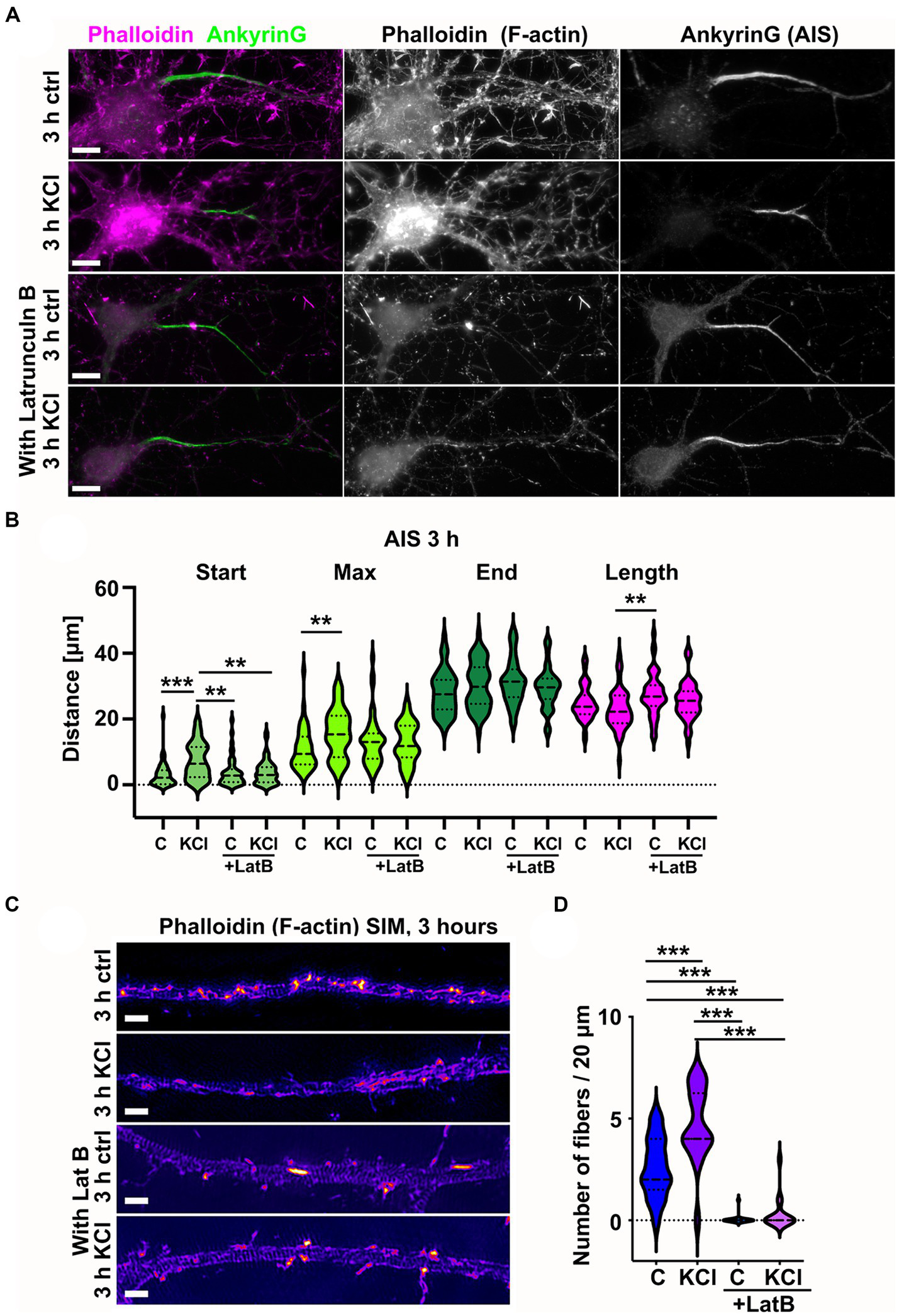 Latrunculin B treatment blocks AIS plasticity and formation of longitudinal actin fibers. (A) DIV14 rat hippocampal neurons were treated with either 15 mM KCl to induce chronic depolarization of neurons or with 15 mM NaCl as a control in the presence or absence of 5 μM latrunculin B. After 3 h, cells were fixed and stained with phalloidin to visualize F-actin (middle column in panel, magenta on left column) and with ankyrinG antibody to visualize the AIS by ankyrinG enrichment (right column and green in left column). Scale bar: 10 μm. (B) The AIS was identified based on ankyrinG staining and the distance was measured from the soma or axonal branching point to the: AIS starting point (Start), point of maximum ankyrinG intensity (Max), and to the end of ankyrinG staining (End). AIS length was calculated from these parameters. Data is pooled from three experiments and represented as mean ± SEM in μm. After 3-h KCl treatment, the average proximal end of AIS moved distally without latrunculin B but in the presence of latrunculin B, this movement did not occur (Ctrl 3.1 ± 0.6; KCl 7.3 ± 0.8; LatB 3.8 ± 0.6; LatB+KCl 3.8 ± 0.5). Similarly, the maximum intensity point moved distally in KCl treatment but not in the presence of Latrunculin B (Max: Ctrl 10.9 ± 1.0; KCl 15.7 ± 1.0; LatB 13.2 ± 1.1; LatB+KCl 12.7 ± 0.9) (End: Ctrl 28.1 ± 1.0; KCl 30.3 ± 1.0; LatB 31.3 ± 1.0; LatB+KCl 29.4 ± 0.9) (Length: Ctrl 25.0 ± 0.8; KCl 23.0 ± 0.9; LatB 27.5 ± 1.0; LatB+KCl 25.6 ± 0.8). For all measurements, Nctrl = 43, NKCl = 50, NLatB = 45, NLatB + KCl = 48. **p < 0.01, ***p < 0.001 as determined by a Kruskal-Wallis test. (C) DIV14 rat hippocampal neurons were treated with 15 mM KCl or 15 mM NaCl (Ctrl) for 3 h with or without latrunculin B. The AIS was identified by ankyrinG staining and approximately 20 μm length of phalloidin staining was imaged with SIM. The 3-h KCl treatment increased the presence of longitudinal actin fibers without latrunculin B, but latrunculin B inhibited formation of longitudinal actin fibers. Scale bar: 1 μm. (D) Longitudinal actin fibers were visually tracked and counted from 20 μm length of the AIS. Data is pooled from 3 experiments and represented as mean ± SEM. 3-h KCl treatment increased the number of fibers from 2.6 ± 0.4 (ctrl) to 4.7 ± 0.4 (KCl). In the presence of latrunculin B, very few cells had any fibers, and this did not change upon KCl addition (0.1 ± 0.1 (LatB) to 0.3 ± 0.2 (LatB+KCl)). Nctrl = 17, NKCl = 18, NLatBl = 18, NLatB + KCl = 16. ***p < 0.001 as determined by a Chi-squared test. Violin plots present the median and interquartile range (25th and 75th percentile).
