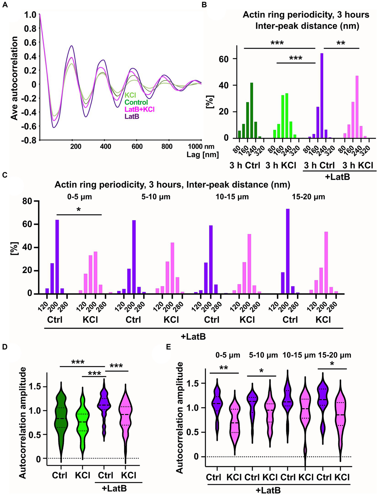 KCl-treatment has a modest effect on actin ring periodicity. (A) Autocorrelation analysis of F-actin distributions of NaCl (Ctrl), KCl, latrunculin B, and latrunculin B and KCl treated neurons (3-h treatment). Shown are the averaged autocorrelation from multiple segments of AIS for each condition. (B) The distance between adjacent peaks in all fluorescence intensity profiles was measured and distributions of inter-peak distances were calculated. Distribution of LatB treated cells differed from others significantly as determined by a Kolmogorov–Smirnov test, **p < 0.01, ***p < 0.001. Data is pooled from 3 (LatB) and 4 (ctrl) experiments and Nctrl = 37, NKCl = 30, NLatBl = 18, NLatB + KCl = 16. (C) Spatial analysis of NaCl-and KCl-treated cells in the presence of latrunculin B shows that frequencies change significantly at the most proximal area of the AIS as determined by a Kolmogorov–Smirnov test, *p < 0.05. Data is pooled from 3 experiments having altogether 18 (LatB) and 16 (LatB+KCl) cells, and four measured areas in each cell. The most proximal area has 15 (LatB) and 12 (LatB+KCl) analyzed areas. (D) The average amplitude of autocorrelation analysis for different treatments (ctrl, KCl, Latrunculin B with and without KCl). The amplitude was measured as the difference between the first peak and the average of the first two valleys of the autocorrelation curve. Amplitudes of latrunculin B treated cells differ from amplitudes in other treatments as determined by a Kruskal-Wallis test, ***p < 0.001. Data is pooled from 3 (LatB) and 2 (ctrl) experiments having altogether 15 (Ctrl), 15 (KCl), 17 (LatB) and 14 (LatB+KCl) cells and 47 (Ctrl), 51 (KCl), 67 (LatB) and 51 (LatB+KCl) areas. (E) Spatial analysis of NaCl-and KCl-treated cells in the presence of latrunculin B shows that amplitude change significantly at three areas as determined by Mann–Whitney U test, *p < 0.05, ** < 0.01. Data is pooled from 3 experiments having altogether 17 (LatB) and 14 (LatB+KCl) cells. The most proximal area has 14 (LatB) and 8 (LatB+KCl) analyzed autocorrelation curves, second area has 21 and 16, third area 20 and 15, and fourth area 12 and 12, respectively. Violin plots present the median and interquartile range (25th and 75th percentile).