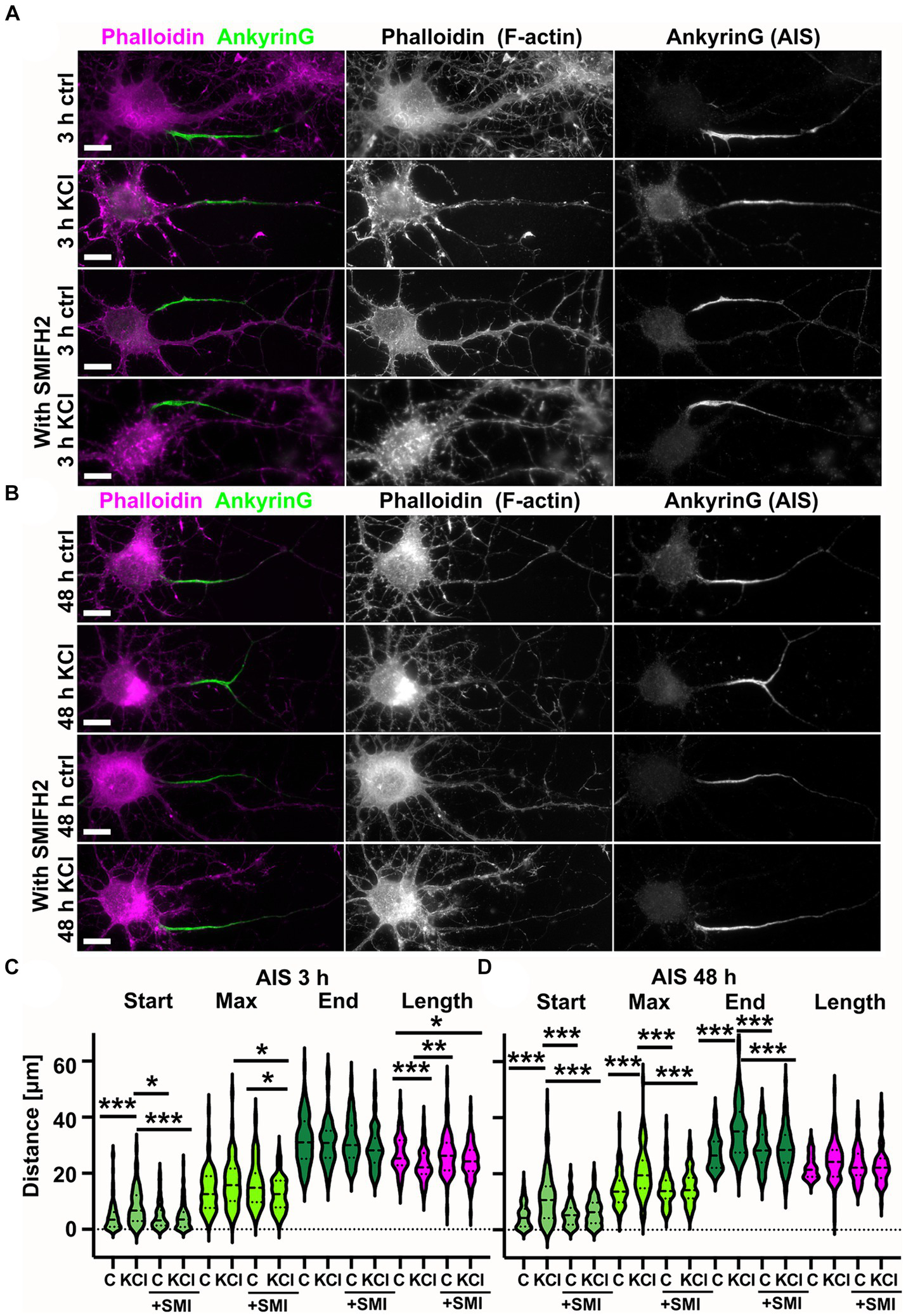 SMIFH2 formin inhibitor abolished chronic depolarization-induced AIS relocation. (A,B) DIV14 rat hippocampal neurons were treated with either 15 mM KCl to induce chronic depolarization of neurons or with 15 mM NaCl as a control in the presence or absence of 10 μM SMIFH2. After 3 h (A) or 48-h (B) cells were fixed and stained with phalloidin to visualize F-actin (middle column in panel, magenta on left column) and with ankyrinG antibody to visualize AIS area by ankyrinG enrichment (right column and green in left column). Scale bar: 10 μm. (C) The AIS was identified based on ankyrinG staining and the distance was measured from the soma or axonal branching point to the: AIS starting point (Start), point of maximum ankyrinG intensity (Max), and to the end of ankyrinG staining (End). AIS length was calculated from these parameters. Data for the three-hour timepoint is pooled from five experiments and represented as mean ± SEM in μm. *p < 0.05, **p < 0.01, ***p < 0.001 as determined by a Kruskal-Wallis test. After 3-h KCl treatment, the average proximal end of the AIS moved distally without SMIFH2 but in the presence of SMIFH2, this movement did not occur (Ctrl 4.6 ± 0.6; KCl 8.0 ± 0.8; SMIFH2 4.9 ± 0.5; SMIFH2 + KCl 4.4 ± 0.4)(Max: Ctrl 13.8 ± 0.8; KCl 16.4 ± 1.0; SMIFH2 16.0 ± 0.8; SMIFH2 + KCl 12.7 ± 0.6)(End: Ctrl 31.6 ± 0.9; KCl 31.0 ± 1.0; SMIFH2 31.6 ± 0.8; SMIFH2 + KCl 28.7 ± 0.7). The length of AIS shortened with KCl (Ctrl 27.0 ± 0.7; KCl 23.0 ± 0.7; SMIFH2 26.7 ± 0.7; SMIFH2 + KCl 24.3 ± 0.6). For all measurements, Nctrl = 87, NKCl = 69, NSMIFH2 = 90, NSMIFH2 + KCl = 99. (D) Data for the 48-h timepoint is pooled from 3 experiments and represented as mean ± SEM. ***p < 0.001 as determined by a Kruskal-Wallis test. After 48-h KCl treatment, the proximal end, maximum intensity point, and end point of the AIS moved distally without SMIFH2 but in the presence of SMIFH2, this movement did not occur (Ctrl 5.0 ± 0.5; KCl 11.2 ± 0.9; SMIFH2 5.6 ± 0.5; SMIFH2 + KCl 6.5 ± 0.6)(Max: Ctrl 14.5 ± 0.7; KCl 20.5 ± 0.9; SMIFH2 14.7 ± 0.7; SMIFH2 + KCl 15.2 ± 0.7)(End: Ctrl 27.4 ± 0.6; KCl 35.7 ± 1.0; SMIFH2 28.9 ± 0.7; SMIFH2 + KCl 29.4 ± 1.0). The length of AIS did not change in any treatment (Ctrl 22.4 ± 0.4; KCl 24.5 ± 0.7; SMIFH2 23.3 ± 0.7; SMIFH2 + KCl 22.9 ± 0.8). For all measurements, Nctrl = 84, NKCl = 89, NSMIFH2 = 85, NSMIFH2 + KCl = 67. Violin plots present the median and interquartile range (25th and 75th percentile).