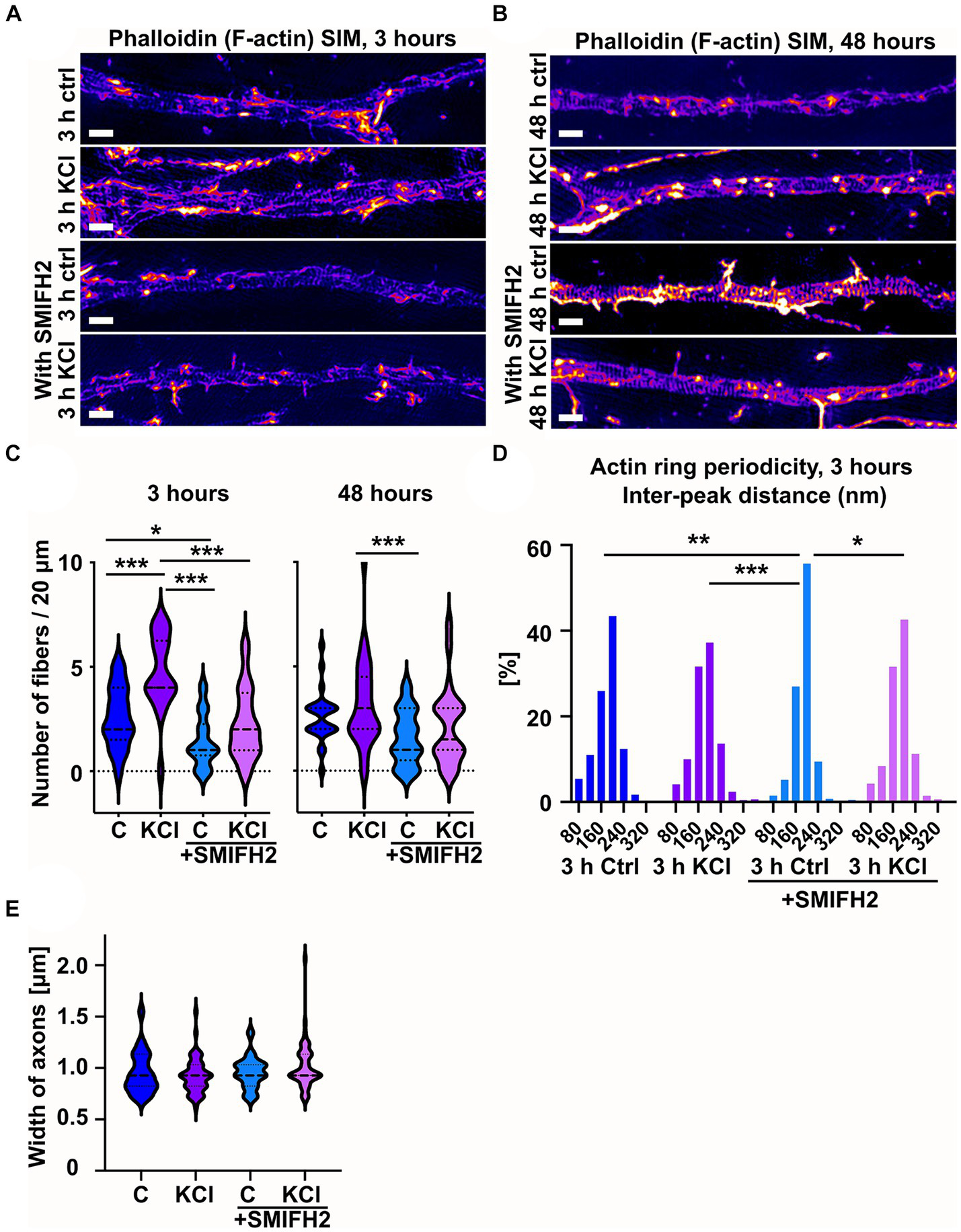 SMIFH2 treatment reduces the number of longitudinal actin fibers. (A,B) DIV14 rat hippocampal neurons were treated with 15 mM KCl or 15 mM NaCl (Ctrl) for 3 h (A) or 48 h (B) with or without SMIFH2. The AIS was identified by ankyrinG staining and approximately 20 μm length of phalloidin staining was imaged with SIM. 3-h KCl treatment increased the presence of longitudinal actin fibers without SMIFH2 but SMIFH2 inhibited formation of longitudinal actin fibers. 48-h long KCl-treatment did not increase the presence of longitudinal actin fibers but SMIFH2 treatment seemed to reduce them. Scale bar: 1 μm. (C) Longitudinal actin fibers were visually tracked and counted from 20 μm length of the AIS. Data is pooled from 3 experiments and represented as mean ± SEM. 3-h KCl treatment increased the number of fibers from 2.6 ± 0.4 (ctrl) to 4.7 ± 0.4 (KCl). In the presence of SMIFH2, the number of fibers was reduced in both ctrl and with KCl (1.5 ± 0.3 (SMIFH2), 2.3 ± 0.3 (SMIFH2 + KCl)). Nctrl = 17, NKCl = 18, NSMIFH2 = 22, NSMIFH2 + KCl = 28. 48-h KCl treatment did not significantly increase the number of longitudinal actin fibers. SMIFH2 treatment decreased the number of fibers when compared to KCl-treatment (2.6 ± 0.3 (ctrl), 3.2 ± 0.4 (KCl), 1.6 ± 0.3 (SMIFH2), 2.1 ± 0.4 (SMIFH2 + KCl)). Nctrl = 24, NKCl = 29, NSMIFH2 = 25, NSMIFH2 + KCl = 22. *p < 0.05, ***p < 0.001 as determined by a Chi-squared test. (D) The distance between adjacent peaks in all fluorescence intensity profiles was measured and distributions of inter-peak distances were calculated. Data is pooled from 4 experiments for control and KCl-treated neurons and from 3 experiments in both SMIFH2-treated conditions. The distribution of SMIFH2 treated cells differed from others significantly as determined by a Kolmogorov–Smirnov test. Nctrl = 37, NKCl = 30, NSMIFH2 = 20, NSMIFH2 + KCl = 24. *p < 0.05, **p < 0.01, ***p < 0.001. (E) The width of analyzed axons was measured from two experiments of 48-h-treatments. The width of axons was similar in controls and SMIFH2 treated cells (0.9–1.0 μm). Nctrl = 45, NKCl = 51, NSMIFH2 = 37, NSMIFH2 + KCl = 48. Violin plots present the median and interquartile range (25th and 75th percentile).