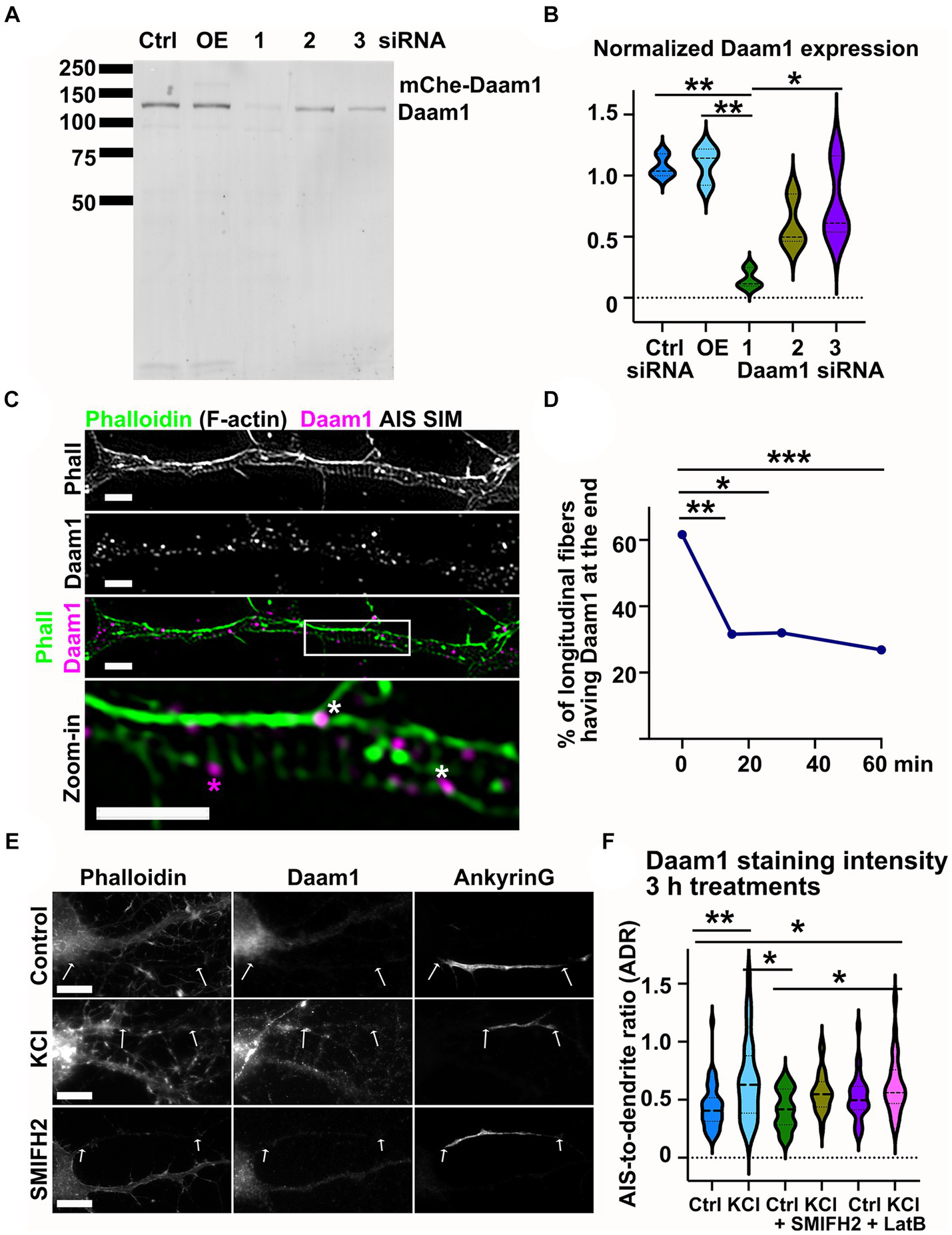 Daam1 localizes to the ends of longitudinal actin fibers in the AIS. (A) Anti-Daam1 antibody western blot of B16F1 cell lysates shows that the antibody can distinguish Daam1 from other proteins. From left to right, control cells treated with control siRNA, cells over-expressing mCherry-Daam1, next 3 bands: cells treated with 3 different siRNAs against Daam1. (B) Daam1 band intensity was compared to total protein. Data presents 3 separate experiments. The first Daam1-targeted siRNA (middle lane) effectively reduces Daam1 expression. *p < 0.05, **p < 0.01 according to a one-way ANOVA and Tukey’s multiple comparison test (C) DIV14 rat hippocampal neurons were fixed and stained with phalloidin (F-actin), Daam1 antibody, and ankyrinG antibody. The AIS was identified by ankyrinG staining and all stainings were imaged with SIM. Daam1 puncta were observed at the ends of longitudinal actin fibers (white stars) and occasionally co-localized with actin rings (magenta star). Scale bar: 1 μm. (D) Longitudinal actin fibers were visually tracked and the presence of Daam1 at the ends was analyzed. In control conditions, 61.6% of fibers had Daam1 at one or both ends. SMIFH2 treatment (10 μM) significantly reduced this portion to 31.6%, 32.0, and 26.9 at the 15-, 30-and 60-min timepoints, respectively. Data was pooled from three experiments and the number of analyzed fibers was Nctrl = 73, NSMIFH2_15min = 38, NSMIFH2_30min = 25, NSMIFH2_60min = 67. *p < 0.05, **p < 0.01, ***p < 0.001 according to a Chi-squared test of equal or given proportions. (E) DIV14 rat hippocampal neurons were treated with either 15 mM KCl to induce chronic depolarization of neurons or with 15 mM NaCl as a control in the presence or absence of 10 μM SMIFH2. After 3 h, cells were fixed and stained with phalloidin to visualize F-actin (left column in panel), with Daam1 antibody to visualize Daam1 (middle column) and with ankyrinG antibody to visualize the AIS by ankyrinG enrichment (right column). AIS areas based on ankyrinG enrichment are marked with two arrows in each image. Scale bar: 10 μm. (F) The relative intensity of Daam1 was analyzed from the AIS and dendrites. In control neurons, Daam1 staining was less bright in the AIS than in dendrites resulting in AIS-to-dendrite ratio of 0.44 ± 0.03 (equal distribution to AIS and dendrites would result in a value of 1). KCl treatment increased the portion of Daam1 in the AIS and AIS-to-dendrite ratio increased to 0.66 ± 0.06. SMIFH2 and latrunculin B treatments inhibited the KCl-induced increase on Daam1 AIS-to-dendrite ratio. Nctrl = 43, NKCl = 37, NSMIFH2 = 29, NSMIFH2 + KCl = 24, NLatB = 30, NLatB + KCl = 29. *p < 0.05, **p < 0.01 as determined by a Kruskal-Wallis test. Violin plots present the median and interquartile range (25th and 75th percentile).