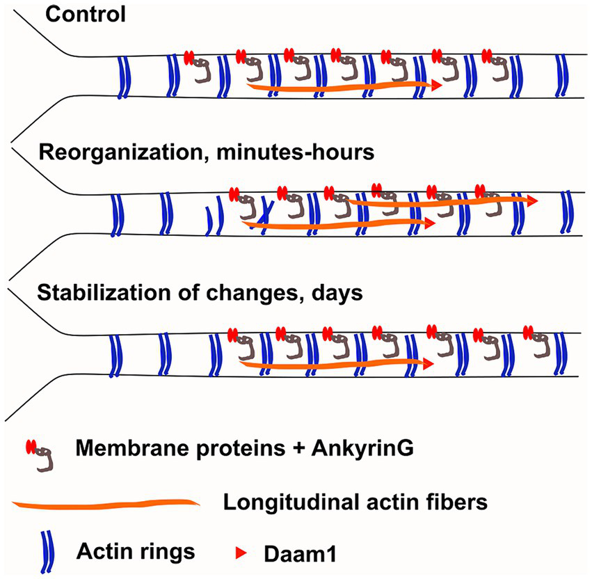 Our working hypothesis is that changes in the actin cytoskeleton during AIS plasticity would have a similar role to synaptic plasticity-induced changes in dendrites or dendritic spines. Upon high frequency stimulation, the actin cytoskeleton in dendritic spines is first dissolved and then quickly re-polymerized and stabilized (Hlushchenko et al., 2016). These changes occur in minutes. The purpose of re-organization of the actin cytoskeleton is that it allows addition or replacement of excitatory synapse receptors. In dendrites, synaptic activation led to a change from actin rings to longitudinal actin fibers in 10 min (Lavoie-Cardinal et al., 2020). While the exact purpose of this change is unclear, we speculate that this increase in dynamic activity in the actin cytoskeleton facilitates or allows other plastic changes to occur. Axonal actin rings are considered to be very stable structures and have previously been shown to not change in the same way as dendritic rings (Lavoie-Cardinal et al., 2020).