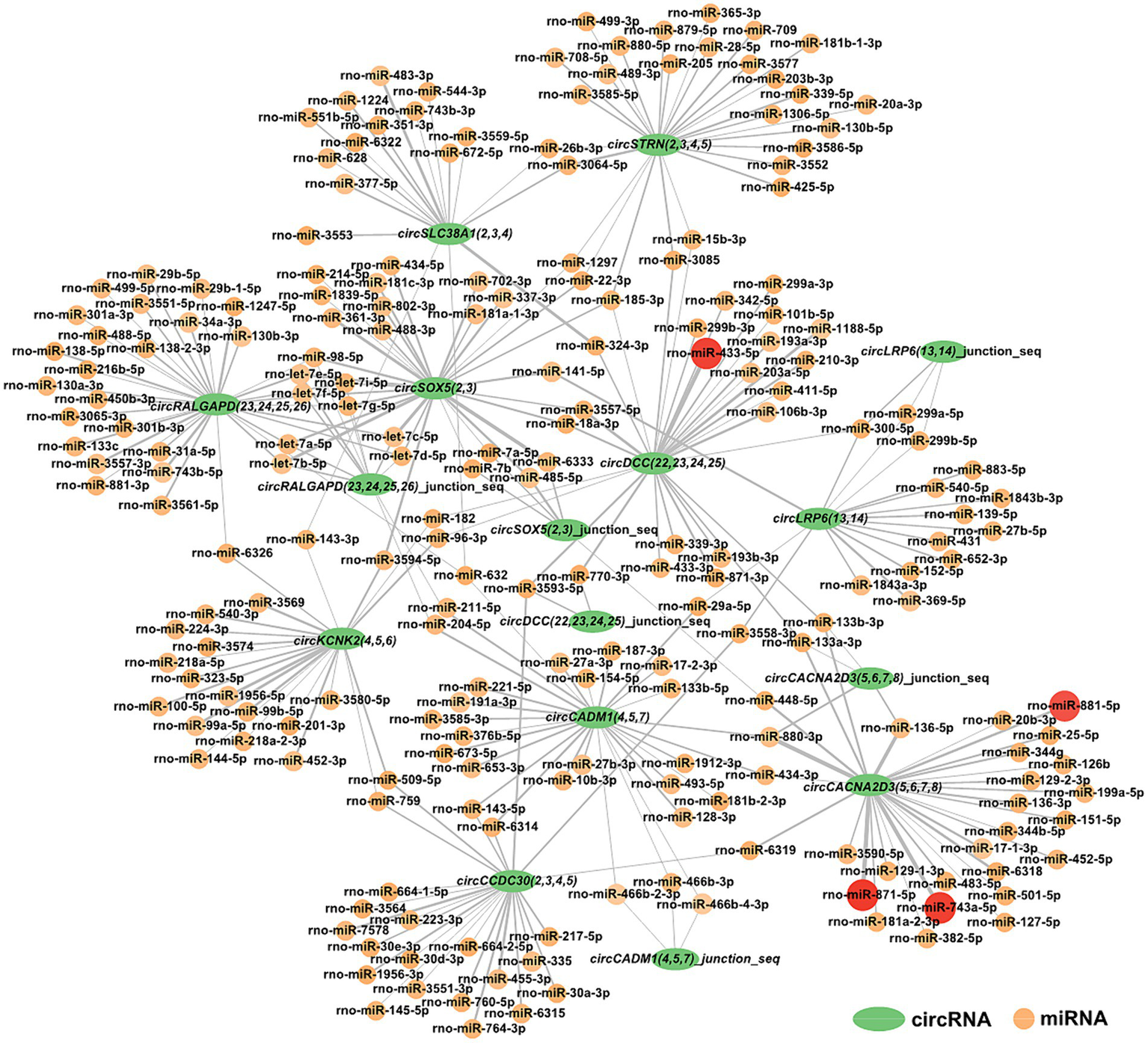For a deeper understanding of circRNAs’ capability in the restraint stress regulatory network in rats, the 10 circRNAs established in our research were predicted for circRNA-miRNA binding using miRanda software. A total of 285 circRNA-miRNA potential binding sites were identified. Using Cytoscape, we constructed a circRNA-miRNA interaction network for these 285 pairs (Figure 5). Notably, circCACNA2D3(5,6,7,8) demonstrates a high binding affinity with rno-miR-881-5p, rno-miR-871-5p, and rno-miR-743a-5p, and circDCC(22,23,24,25) exhibits a robust interaction with rno-miR-433-5p.