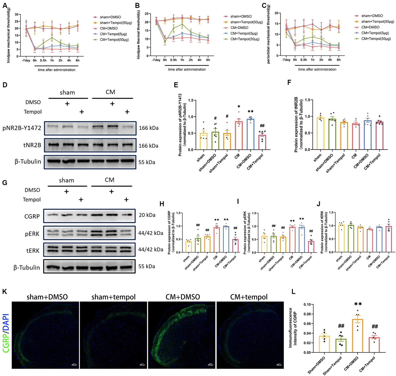 Tempol ameliorated allodynia and attenuated NR2B-Y1472 phosphorylation in CM rats. (A–C) The hind paw mechanical thresholds, hind paw thermal thresholds, and periorbital mechanical thresholds in each group. Two-way ANOVA with the Bonferroni post hoc test. Data were expressed as mean ± SEM. **p < 0.01 vs. the Sham + DMSO group; #p < 0.05, ##p < 0.01 vs. the CM + DMSO group; n = 6/group. (D–F) The representative western blot images and quantification of pNR2B-Y1472 and tNR2B levels (n = 6/group). (G–J) The representative western blot images and quantifications of CGRP, pERK, and tERK levels (n = 6/group). (K,L) The representative immunofluorescence images and quantification of CGRP (Scale bars = 200 μm; n = 5/group). One-way ANOVA with Dunnett’s post hoc test. Data were expressed as mean ± SEM. *p < 0.05, **p < 0.01 vs. the Sham group; #p < 0.05, ##p < 0.01 vs. the CM group.