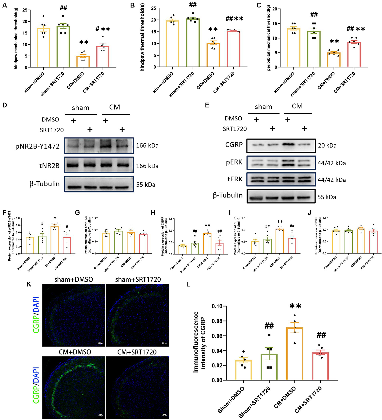 Treatment with SRT1720 ameliorated allodynia and attenuated NR2B-Y1472 phosphorylation in CM rats. (A–C) The hind paw mechanical thresholds, hind paw thermal thresholds, and periorbital mechanical thresholds in each group (n = 6/group). (D,F,G) The representative western blot images and quantifications of pNR2B-Y1472 and tNR2B levels (n = 6/group). (E,H–J) The representative western blot images and quantifications of CGRP, pERK, and tERK levels (n = 6/group). (K,L) The representative immunofluorescence images and quantification of CGRP (Scale bars = 200 μm; n = 5/group). One-way ANOVA with Dunnett’s post hoc test. Data were expressed as mean ± SEM. *p < 0.05, **p < 0.01 vs. the Sham + DMSO group; #p < 0.05, ##p < 0.01 vs. the CM + DMSO group.