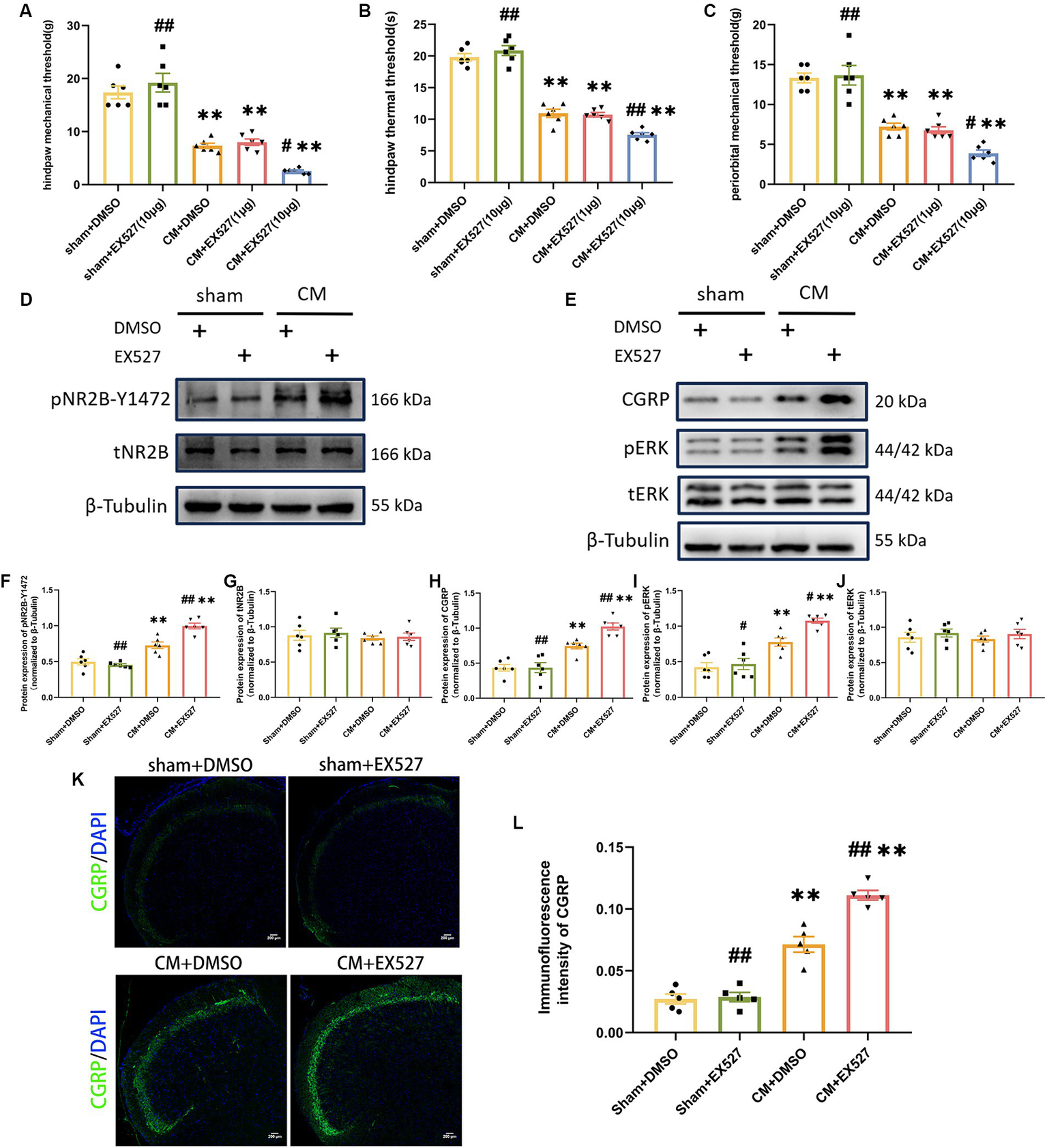 Figure 5. Treatment with EX527 exacerbated allodynia and aggravated NR2B-Y1472 phosphorylation in CM rats. (A–C) The hind paw mechanical thresholds, hind paw thermal thresholds, and periorbital mechanical thresholds in each group (n = 6/group). (D,F,G) The representative western blot images and quantifications of pNR2B-Y1472 and tNR2B levels (n = 6/group). (E,H-J) The representative western blot images and quantifications of CGRP, pERK, and tERK levels (n = 6/group). (K,L) The representative immunofluorescence images and quantification of CGRP (Scale bars = 200 μm; n = 5/group). One-way ANOVA with Dunnett’s post hoc test. Data were expressed as mean ± SEM. **p < 0.01 vs. the Sham + DMSO group; #p < 0.05, ##p < 0.01 vs. the CM + DMSO group.