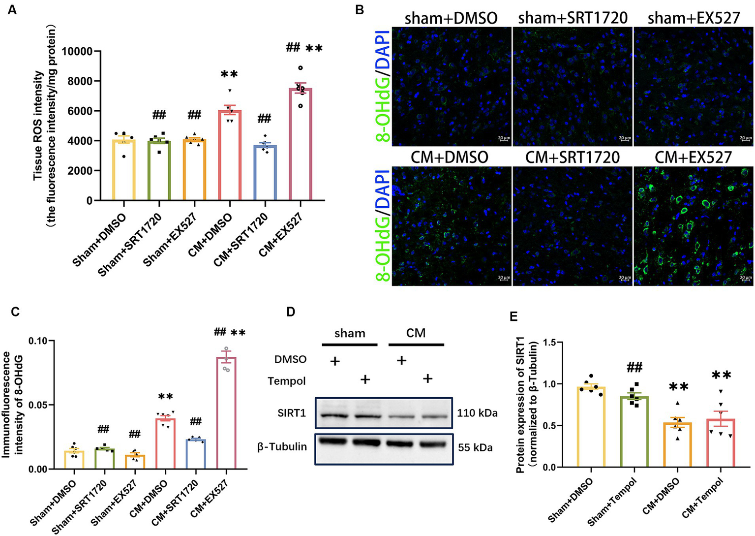 Figure 6. Inhibition and promotion of ROS production in CM rats treated with SRT1720 and EX527. (A) The tissue ROS intensity in the TNC of the rats (n = 6/group). (B,C) The representative immunofluorescence images and quantification of 8-OHdG (Scale bars = 20 μm; n = 5-6/group). (D,E) The representative western blot images and quantifications of SIRT1 levels (n = 6/group). One-way ANOVA with Dunnett’s post hoc test. Data were expressed as mean ± SEM. **p < 0.01 vs. the Sham + DMSO group; ##p < 0.01 vs. the CM + DMSO group.