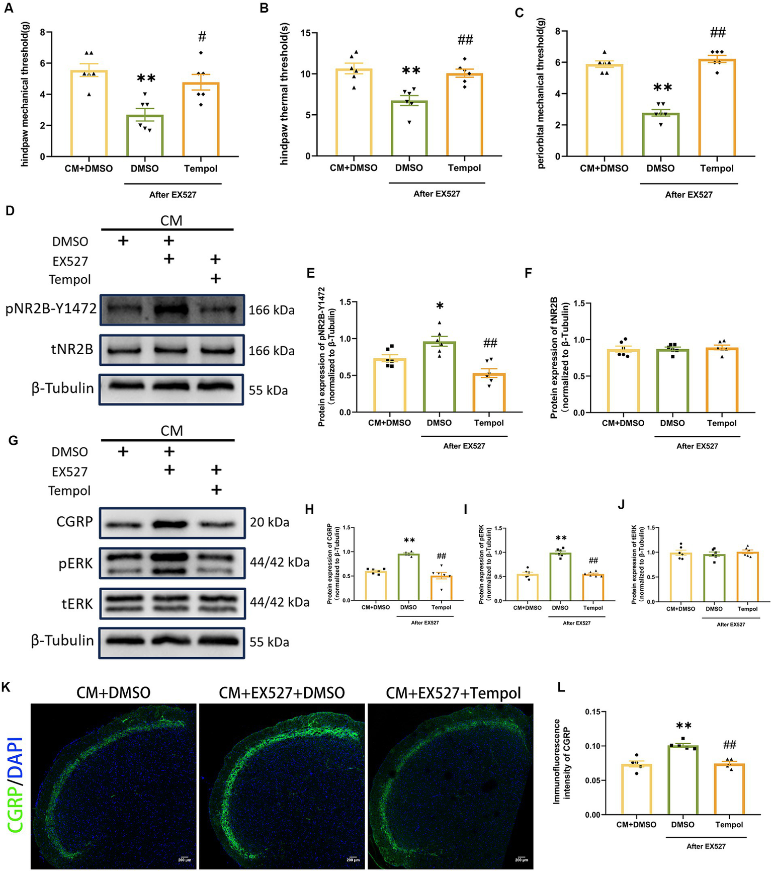 Figure 7. Tempol reversed the EX527-evoked exacerbation of allodynia and hyperphosphorylation of NR2B-Y1472 in CM rats. (A–C) The hind paw mechanical thresholds, hind paw thermal thresholds, and periorbital mechanical thresholds in each group (n = 6/group). (D–F) The representative western blot images and quantifications of pNR2B-Y1472 and tNR2B levels (n = 6/group). (G–J) The representative western blot images and quantifications of CGRP, pERK, and tERK levels (n = 6/group). (K,L) The representative immunofluorescence images and quantification of CGRP (Scale bars = 200 μm; n = 5/group). One-way ANOVA with Dunnett’s post hoc test. Data were expressed as mean ± SEM. *p < 0.05, **p < 0.01 vs. the CM + DMSO group; #p < 0.05, ##p < 0.01 vs. the CM + EX527 + DMSO group, there was no significant difference between the CM + DMSO group and the CM + EX527 + Tempol group.