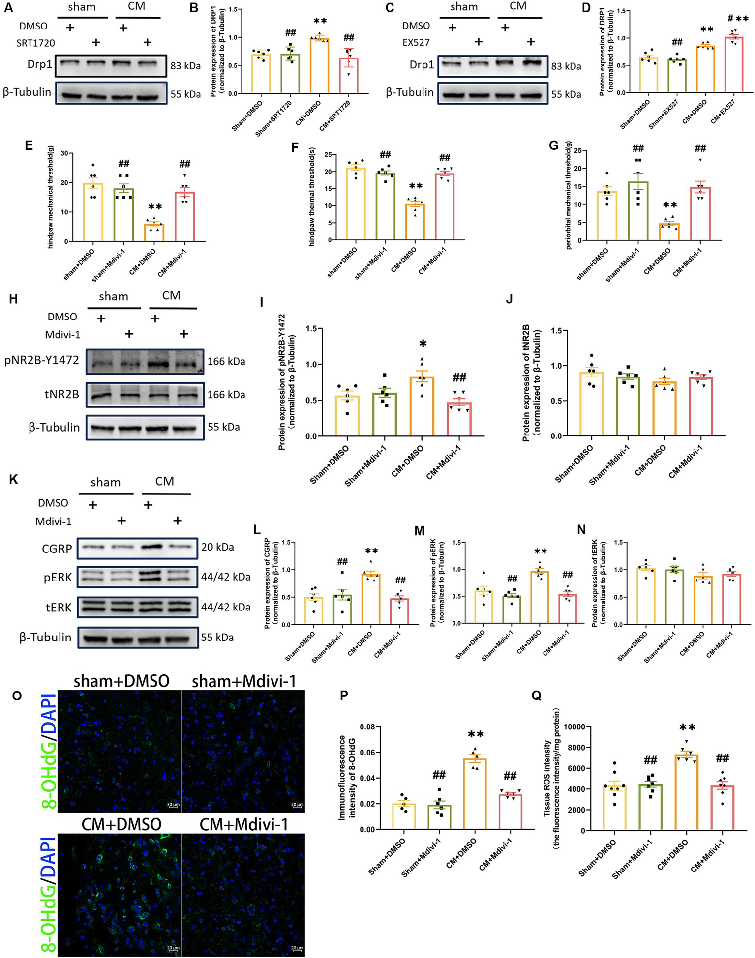 Figure 8. DRP1 may be partially involved in the regulation of ROS generation and NR2B-Y1472 phosphorylation by SIRT1. (A–D) The representative western blot images and quantification of DRP1 level (n = 6/group). (E–G) The hind paw mechanical thresholds, hind paw thermal thresholds, and periorbital mechanical thresholds in each group (n = 6/group). (H–N) The representative western blot images and quantifications of pNR2B-Y1472, tNR2B, CGRP, pERK, and tERK levels (n = 6/group). (O,P) The representative immunofluorescence images and quantification of 8-OHdG (Scale bars = 20 μm; n = 5–6/group). (Q) The tissue ROS intensity in the TNC of the rats (n = 6/group). One-way ANOVA with Dunnett’s post hoc test. Data were expressed as mean ± SEM. *p < 0.05, **p < 0.01 vs. the Sham + DMSO group; #p < 0.05, ##p < 0.01 vs. the CM + DMSO group.