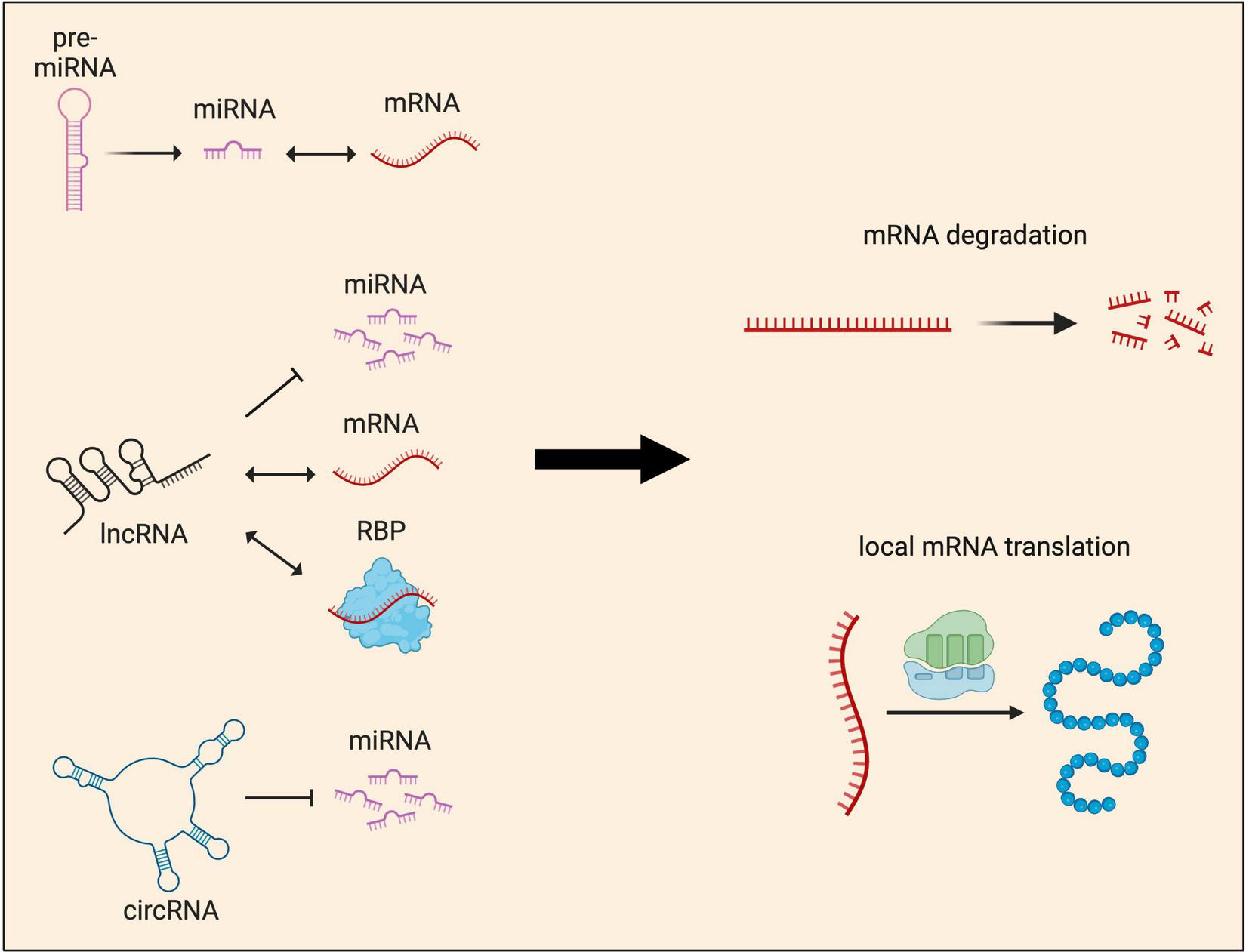 messenger RNA (mRNA), local mRNA translation, cleavage and polyadenylation, stability and degradation, intron retaining RNA (IR RNA), microRNA (miRNA), long non coding RNA (lncRNA), circular RNA (circRNA)