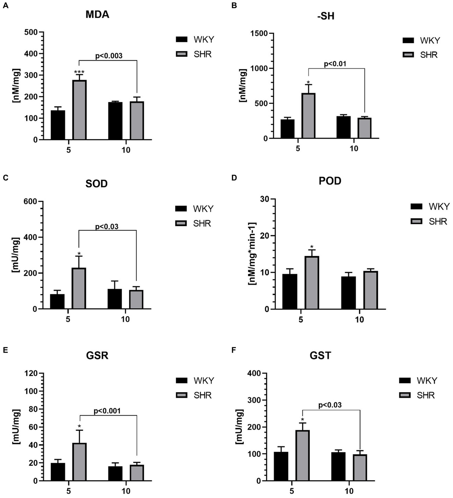 All studied oxidative stress markers were significantly higher in 5-week-old SHRs compared to age-matched control (Figures 5A–F). Moreover, the levels of MDA (Figure 5A), -SH (Figure 5B), SOD (Figure 5C), GSR (Figure 5E), and GST (Figure 5F) were significantly higher in 5-week SHRs compared to 10-week-old animals.
