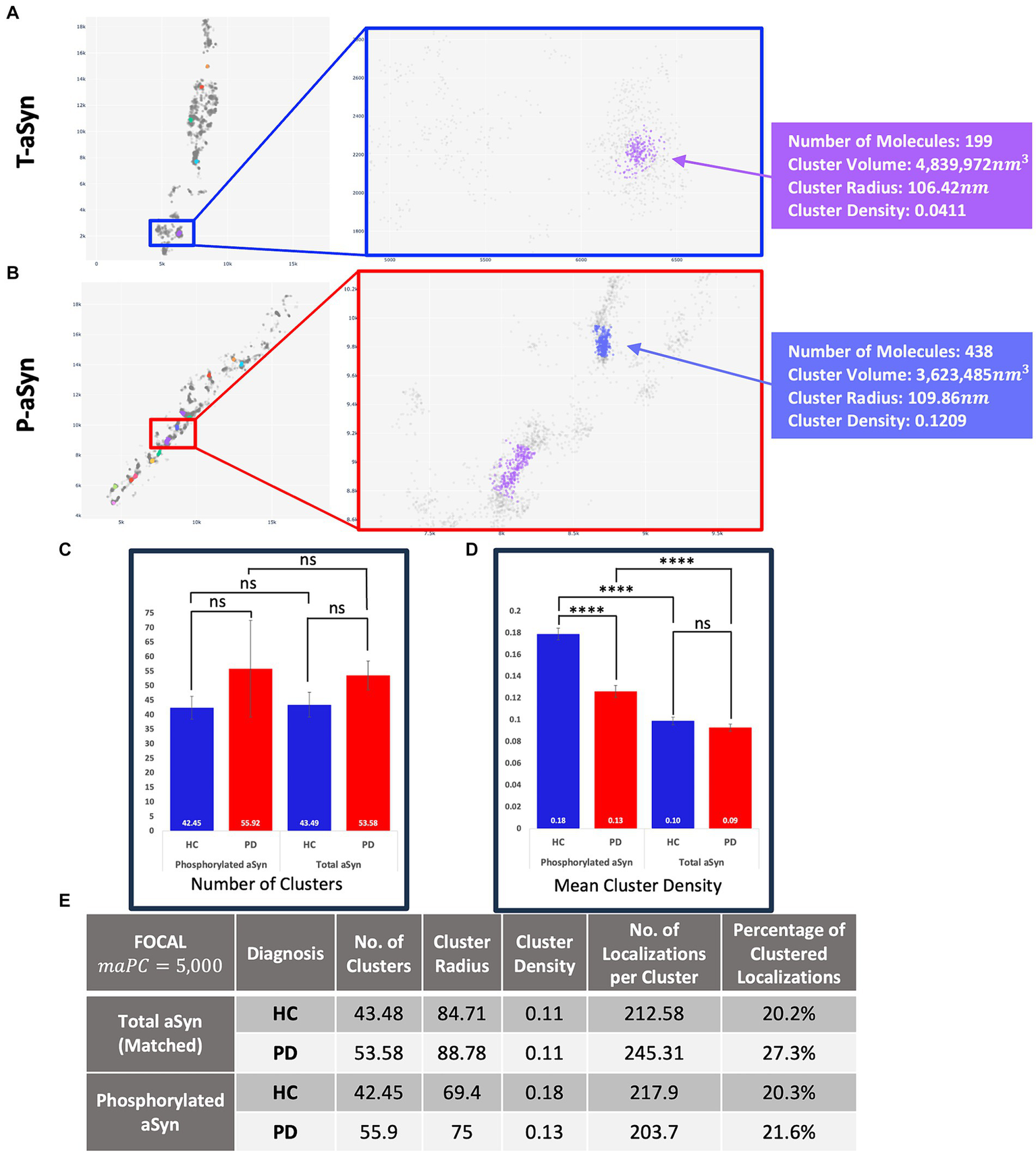 t-aSyn aggregates are larger and less dense compared to p-aSyn aggregates in both PD patients and HC subjects. Comparison of t-aSyn and p-aSyn clustering in PD patients and HC subjects using FOCALPC2. (A,B) Visualizations of clusters of t-aSyn (A) and p-aSyn in a PD patient (B). (C–E) t-aSyn aggregates are larger and less dense compared to p-aSyn aggregates for both PD patients and HC subjects. ****p < 0.0001.