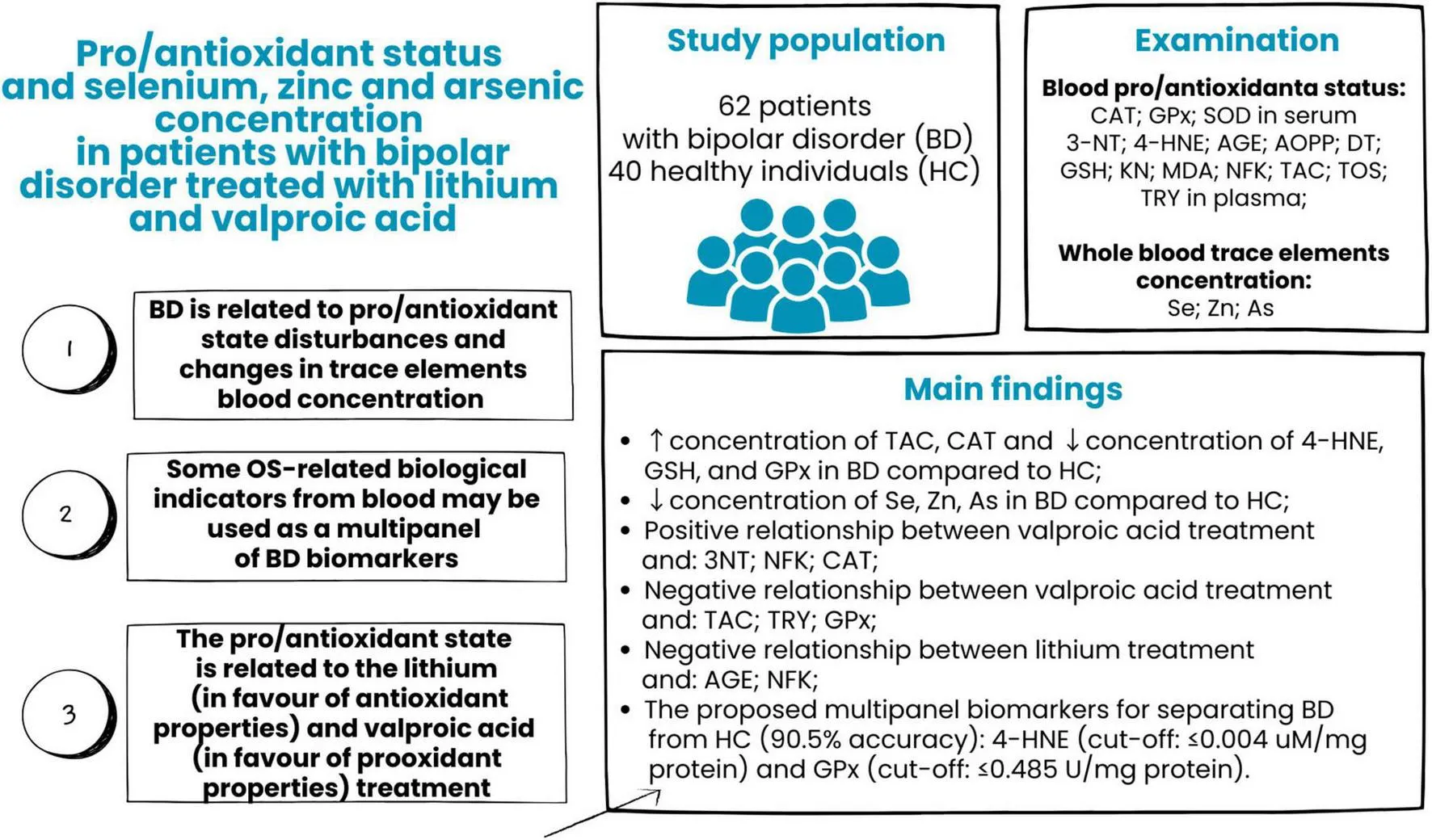 OS is an imbalance between antioxidant defenses and free radical production. OS leads to a disruption of redox signaling and control and/or molecular damage (Jomova et al., 2023). When free radicals are overproduced, a disruption of redox signaling controls and/or damages biological molecules, such as proteins, DNA, and lipids (Cecerska-Heryć et al., 2022). OS may interact with immune-inflammatory pathways and contribute to neurodegeneration (Teleanu et al., 2022). The negative impact of pro/antioxidant imbalance on the human body could be diminished by counteracting antioxidant enzymes: superoxide dismutase (SOD), glutathione peroxidase (GPx) or catalase (CAT). Lastly, more attention is paid to pro- and antioxidants delivered (intentionally or unintentionally) with food. Selenium (Se) is an important antioxidant and active micronutrient. Twenty-five selenoproteins (including SOD) in humans are involved in a wide variety of biological functions, at least. It has been shown that Se is involved in various biological processes related to mental disorders, such as neurotransmission, maintaining pro/antioxidant and pro/anti-inflammatory homeostasis (Bjørklund et al., 2022). The decreased blood levels of Se in individuals suffering from mental disorders, compared to healthy individuals, have been reported in some studies (Baj et al., 2020; Santos et al., 2022). It remains unclear whether Se status may be associated with the etiology of BD. However, the model studies find Se protective properties against diverse side effects related to lithium (Li) treatment (widely used in BD), including distribution in microelements homeostasis [including zinc (Zn), which is suggested to reduce or prevent depressive symptoms], changes in antioxidant enzymes blood levels and oxidant disturbances in the brain (Kiełczykowska et al., 2014, 2018; Kielczykowska et al., 2015). The negative impact of arsenic (As) on metabolic pathways modulated by Se has been shown. The authors suggest avoiding using Li in patients vulnerable to As exposure (f.e., by drinking water or living in an arsenic-contaminated area) because Li enhances the adverse effects caused by As (Bhardwaj et al., 2018).