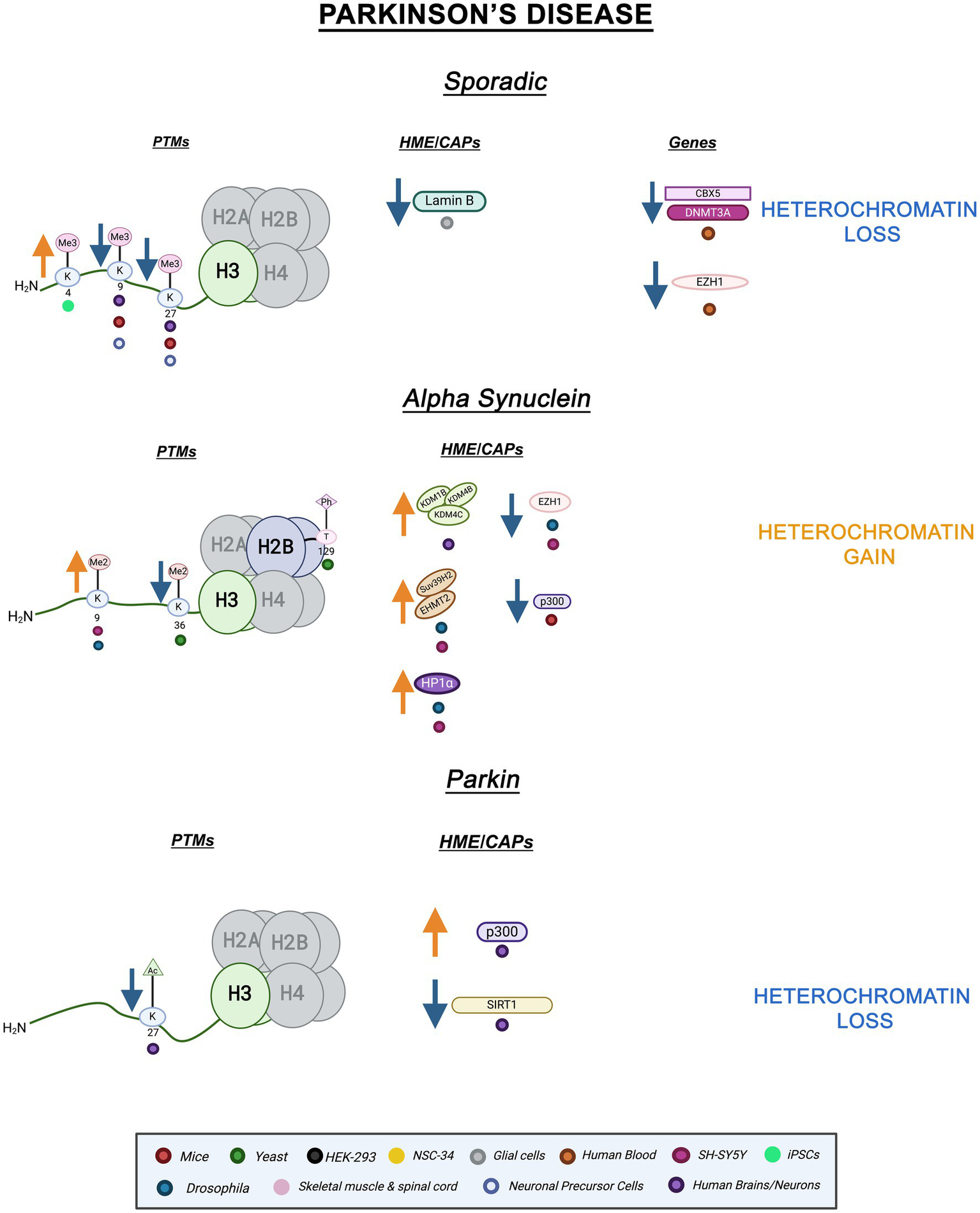 Epigenetic alterations are linked to sporadic and familial PD. Columns indicate histone post-translational modifications (PTMs), genes, histone-modifying enzymes (HMEs) and chromatin-associated proteins (CAPs) altered in PD. Columns are omitted when no changes are revealed. Yellow arrows denote increases in the levels of proteins, genes, or histone post-translational modifications, while blue arrows denote protein, gene, or post-translational modification level decreases. Colored dots indicate the model system as depicted in the legend. Global heterochromatin gain is indicated in yellow font, while global heterochromatin loss is indicated in blue font. Figure created with Biorender.com.