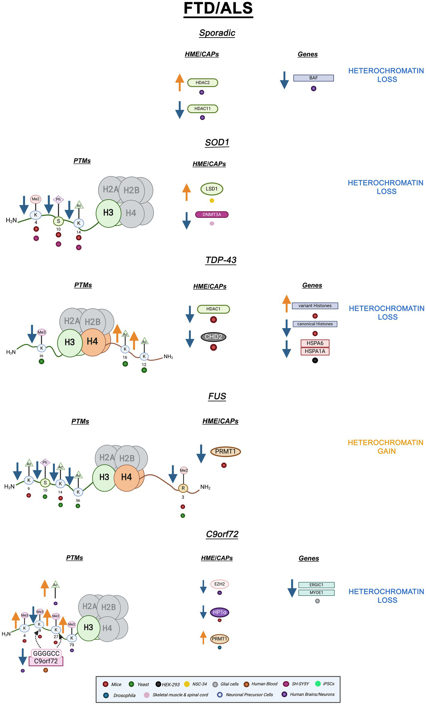 Epigenetic alterations are linked to sporadic and familial FTD/ALS. Columns indicate histone post-translational modifications (PTMs), genes, histone-modifying enzymes (HMEs), and chromatin-associated proteins (CAPs) altered in PD. Columns are omitted when no changes are revealed. Yellow arrows denote increases in the levels of proteins, genes, or histone post-translational modifications, while blue arrows denote protein, gene, or post-translational modification level decreases. Black arrows denote binding interactions. Colored dots indicate the model system as depicted in the legend. Global heterochromatin gain is indicated in yellow font, while global heterochromatin loss is indicated in blue font. Figure created with Biorender.com.