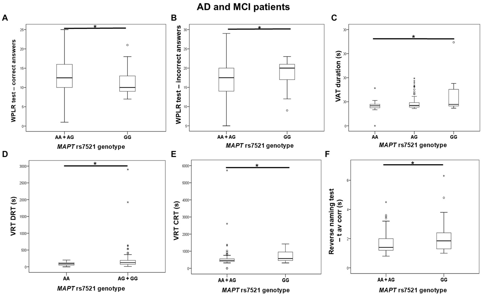 G allele carriers in the MAPT rs242557 polymorphism had worse performance on the CVLT test compared to AA homozygotes. Specifically, levels of CVLT d and CVLT 1–5 were significantly decreased in G allele carriers compared to AA homozygotes. According to the NPI assessment, GG homozygotes were more depressed than A allele carriers. Moreover, worse performance on VAT (higher levels of VAT, VAT time, and VAT t average) was shown for G allele carriers compared to AA homozygotes (Figure 2; Table 3). PPLR t incorr levels were also higher in carriers of the G allele compared to AA homozygotes.