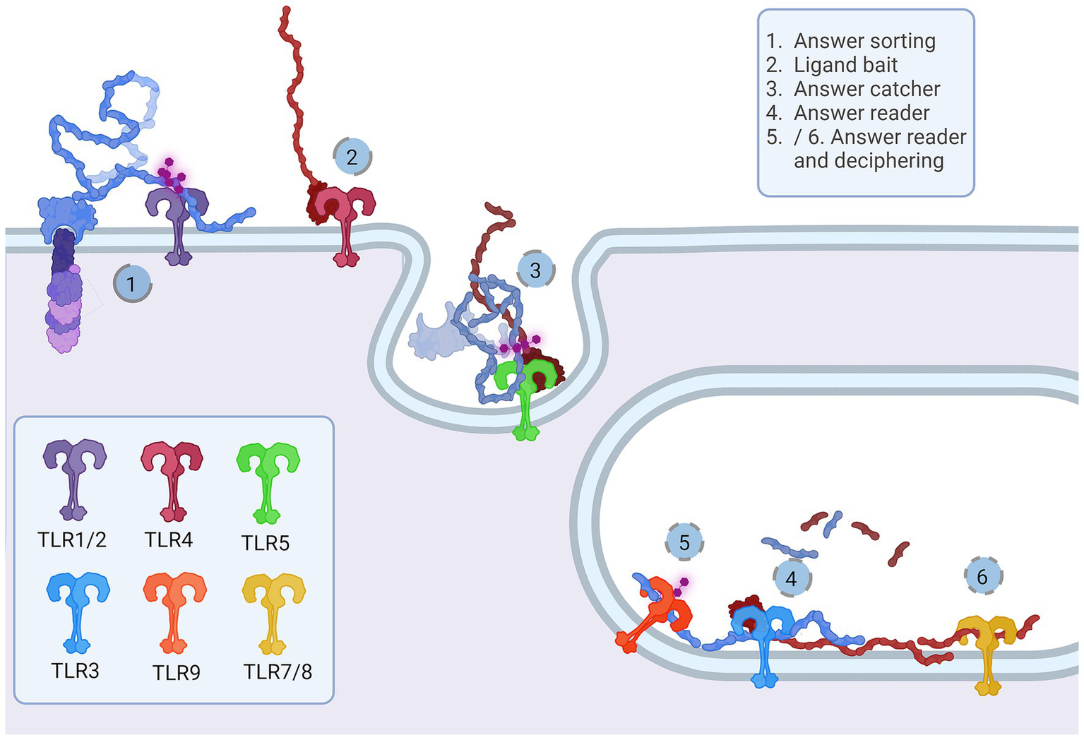 Representation of the proposed Notch-TLR pathway. Each step of the Notch cascade is accompanied by TLR dimerization and downstream signal amplification. TLR1/2/6 Notch sorting and choosing (1) binds DSL ligand fetched by TLR4 (2). The other cell senses the tension and pulls of NECD/DSL complex where TLR5 confirmes catch (5). In endosome, TLR3 signals if NECD/DSL complex is present (4) while TLR7/8/9 fine tunes the answer by examination of EGF PTMs (5 and 6). The accumulation of Notch stimulation of individual TLR proteins regulates NF-κB, JNK, ERK and p38 programes input driving cellular behavior. Created in BioRender. BioRender.com/a30x851.