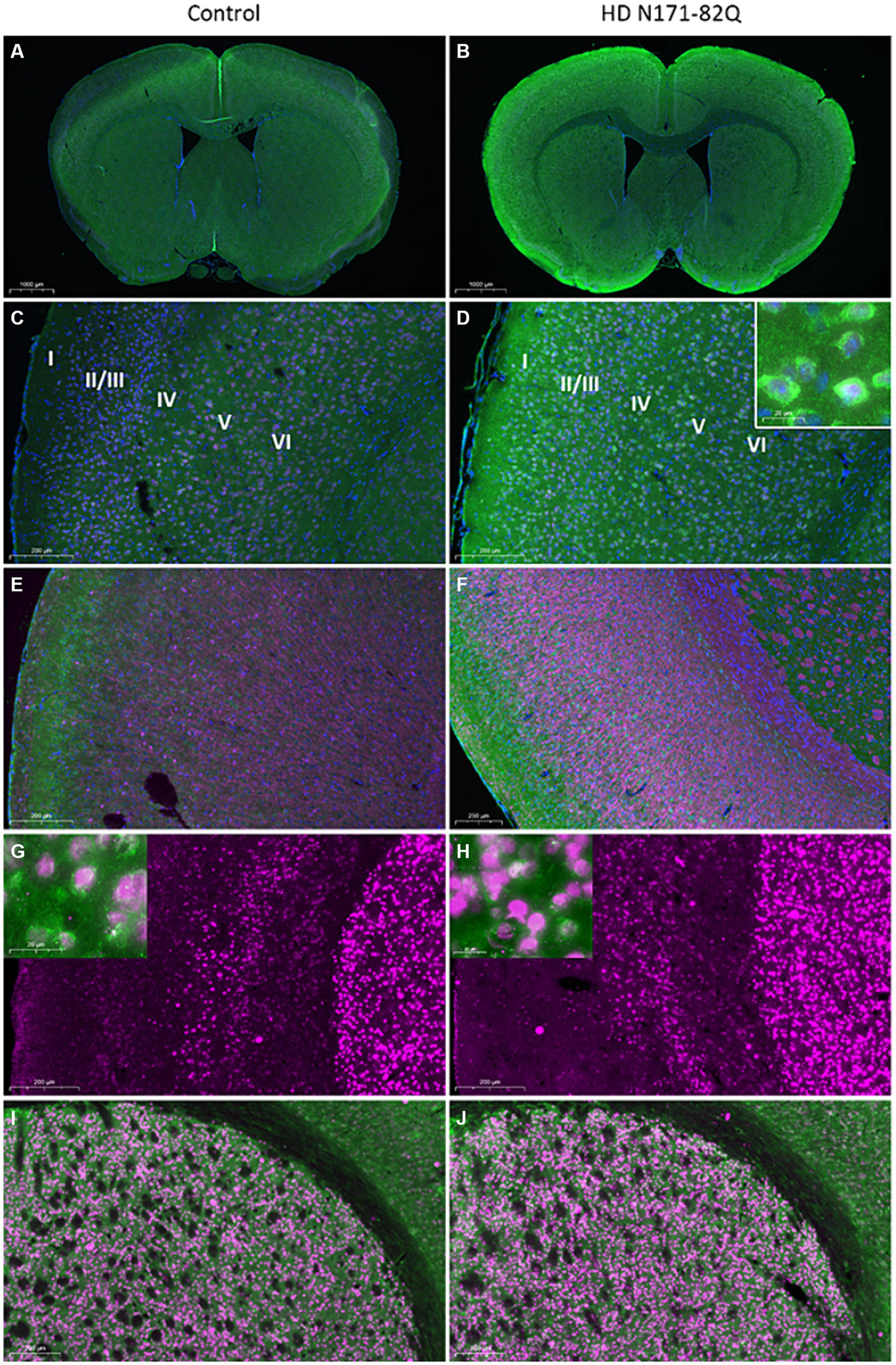 Immunohistochemistry of CNPY2 and CTIP2 in mouse brain cortex and striatum. The number of immunopositive CNPY2 and CTIP2 cells in the cortex and in the striatum was determined by immunostaining in 16-week-old (A–F) or 19-week-old (G–J) control and HD N171-82Q mice. (A–F). Immunostaining of CNPY2 was performed on paraffin slices from 16-week-old mice as described in Methods in conjunction with anti-NeuN antibodies as a marker for neurons. Left, Control female mice (A,C,E). Right similar HD N171-82Q female mice (B,D,F). (A,B) CNPY2 positive cells are shown in green color, NeuN positive cells are red/violet, and nuclei are stained by DAPI (blue color). Note an increased immunolabeling of CNPY2 in the N171-82Q mice. (C,D) Cortical layers are here labeled I to VI. The insert in (D) shows NeuN immunopositive nuclei with CNPY2 in the cytosol. (E,F) CNPY2 (green) immunolabeled cells are present in cortical layer 2/3 and 5/6 and are increased in the N171-82Q mice. Myelin immunolabeled by the CNPase antibody is in red and encircles the axons of the cortical neurons. Scale bars: (A,B) 1,000 μm; (C–F) 200 μm. (G-J). Immunostaining of CTIP2 and CNPY2 in 19-week-old mouse brain. Free-floating slices from control (G,I) and N171-82Q mouse brain (H,J) were immunostained as described above in conjunction with an antibody against the transcription factor, CTIP2. (G,H) Immunopositive CTIP2 cells (red color) in cortical layer 5 and in the striatum. Scale bar: 200 μm. The inserts show double labeling of striatal neurons expressing CTIP2 (red nuclei) and CNPY2 (green cytosol). Scale bar: 20 μm. (I,J) Double immunostaining of CTIP2 (red) and CNPY2 (green) in the striatum. Scale bar: 200 μm.