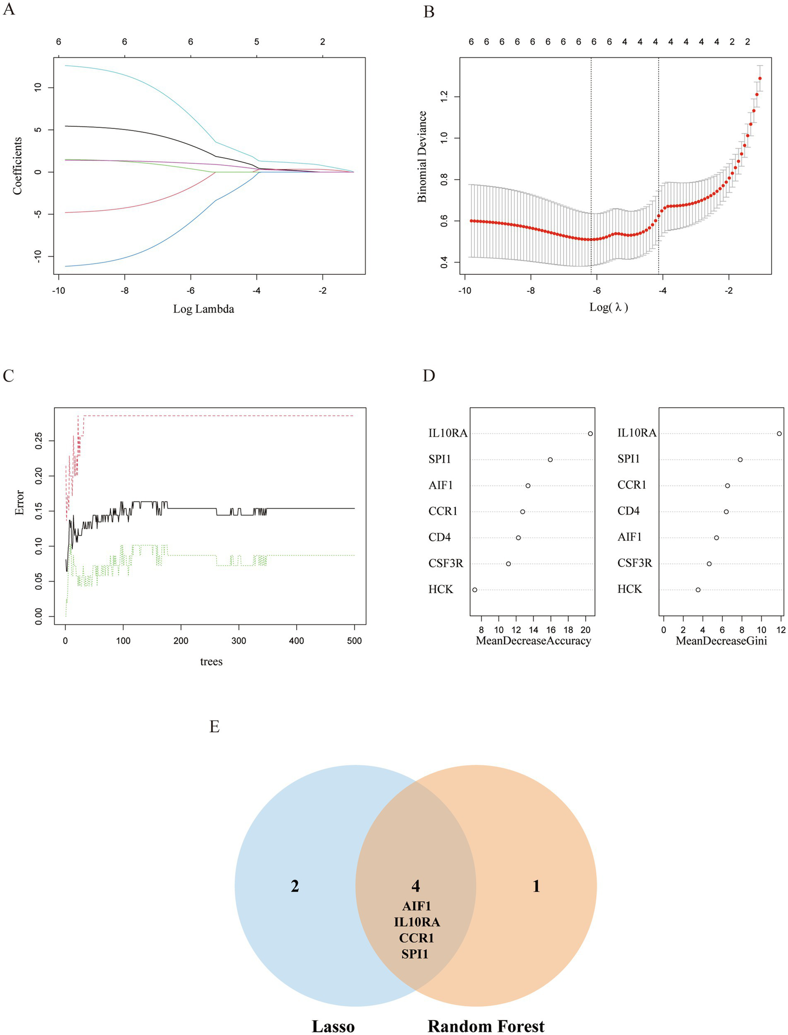 Identification of candidate diagnostic biomarkers for ISM-related AS by machine learning methods. (A,B) LASSO regression analysis was applied to screen diagnostic biomarkers based on the 7 hub genes. The hub genes with the minimum binominal deviance were identified as the most suitable candidate genes. (C,D) RF algorithm used to rank the importance of 7 Hub genes. The top 5 genes in the importance ranking graph (D) were identified as the most suitable candidate genes. (E) The Venn diagram depicting common candidate diagnostic markers of LASSO and RF. ISM, insomnia; AS, atherosclerosis; LASSO, least absolute shrinkage and selection operator; RF, random forest; AIF1, allograft inflammatory factor 1; IL10RA, interleukin 10 receptor subunit alpha; CCR1, C-C motif chemokine receptor 1; SPI1, Spi-1 proto-oncogene.