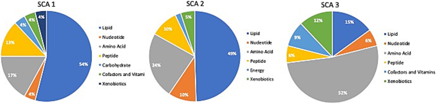 Identification of altered metabolic pathways for SCA (p < 0.01). Lipid metabolism was the primary altered super pathway in SCA 1 and SCA 2, which accounted for 54 and 49%, respectively, of the affected metabolic pathways. In contrast, SCA 3 exhibited a more prominent alteration in amino acid metabolism, affecting 52% of the affected metabolic pathways in SCA 3.