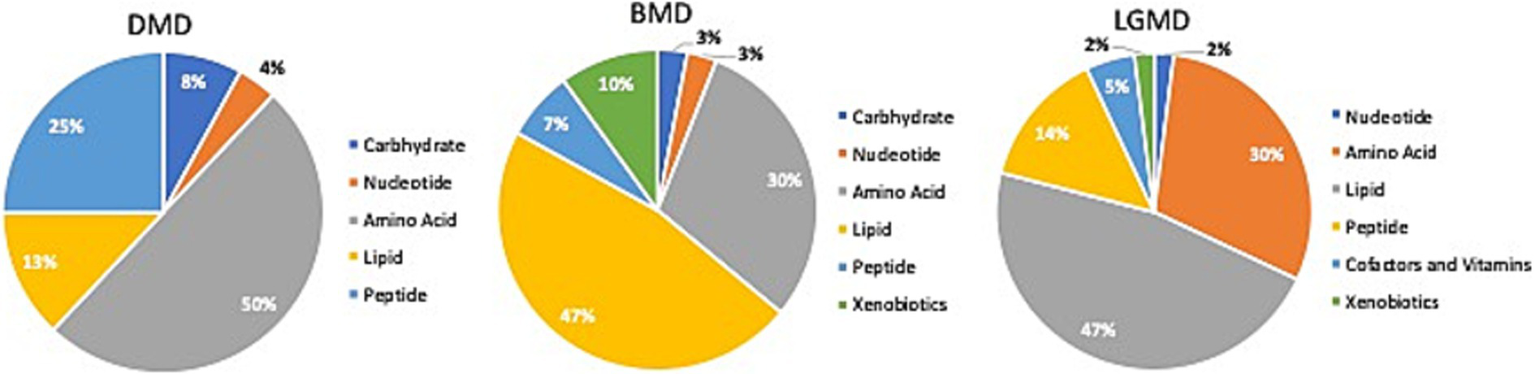 Identification of altered metabolic pathways for MD (p < 0.01). Amino acid metabolism was the primary altered super pathway in DMD, which accounted for 50% of the affected metabolic pathways. This was followed by carbohydrate metabolism at 25% and lipid metabolism at 13%. In contrast, BMD and LGMD 2A exhibited a more prominent alteration in lipid metabolism, affecting 47% of the affected metabolic pathways in both BMD and LGMD 2A. Amino acid metabolism accounted for 30% of the affected metabolic pathways in both BMD and LGMD 2A.