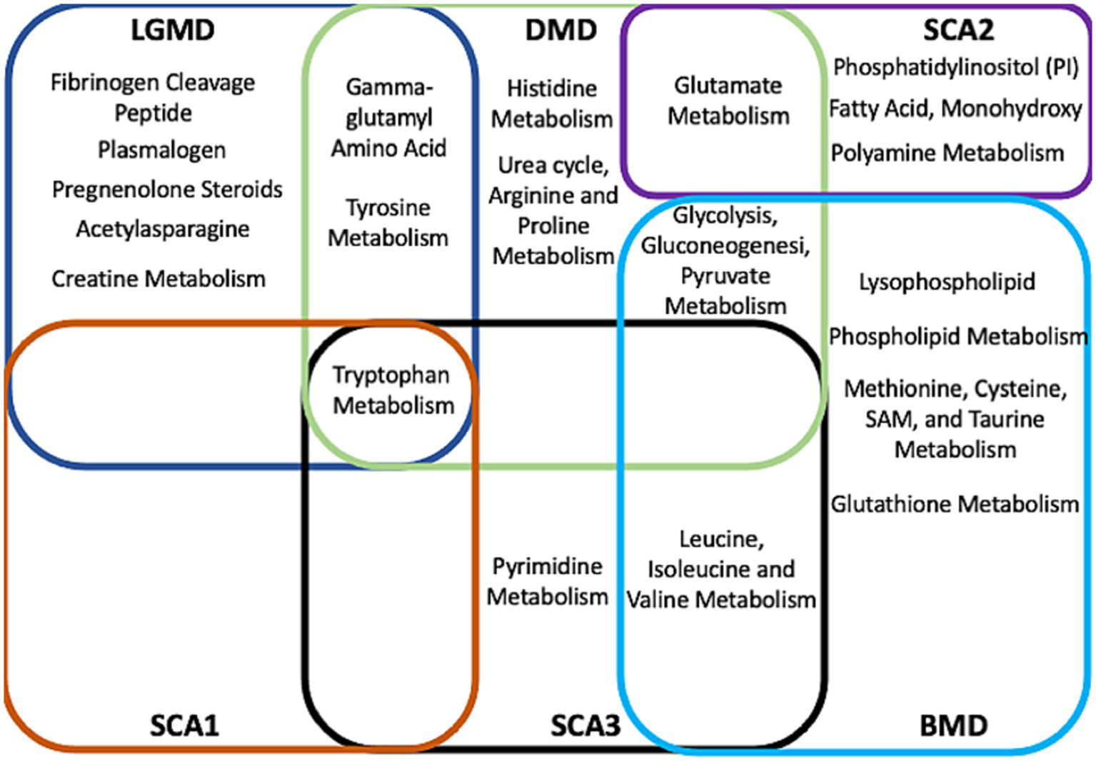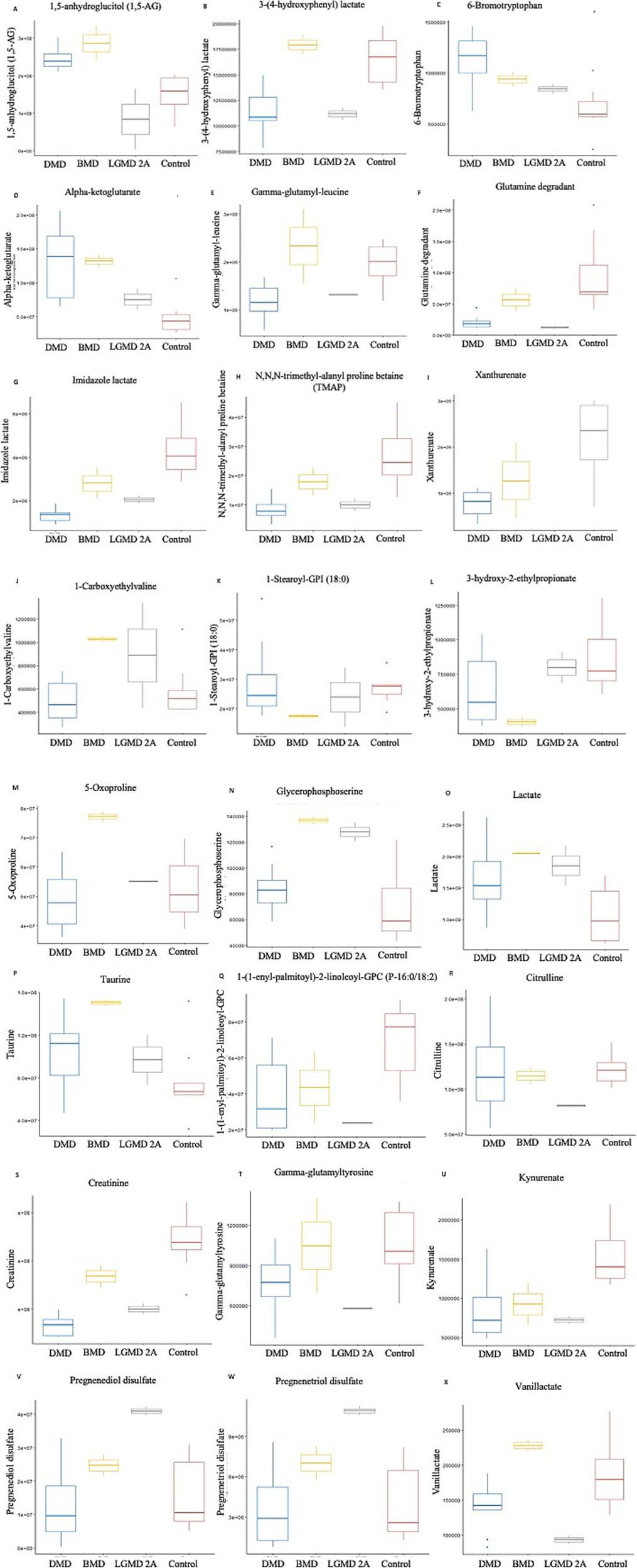 A study conducted by Srivastava et al. (2016) examined the metabolites in the serum of patients with multiple forms of muscular dystrophy, including DMD, BMD, LGMD 2B, facioscapulohumeral muscular dystrophy (FSHD), and myotonic dystrophy (DM), in the North and North-East Indian populations. They found that serum from patients with DMD, BMD, FSHD, and DM had elevated levels of branched-chain amino acids (valine, leucine, isoleucine), whereas patients with DMD, BMD, LGMD-2B, and FSHD had reduced levels of glutamine. In addition, the tyrosine levels in the serum of patients with BMD were higher compared with that of normal subjects (Srivastava et al., 2016).