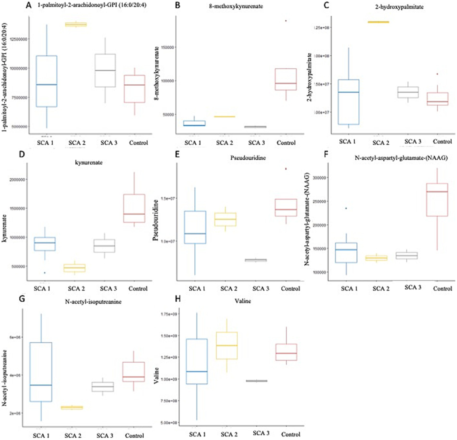 A total of 28 patients (SCA 1-10, SCA 2-2, SCA 3-2, DMD-10, BMD-2, LGMD-2) and eight controls (aged 8–65 years) were included. Metabolomic analysis was performed by Ultrahigh Performance Liquid Chromatography-Tandem Mass Spectroscopy (UPLC-MS/MS), with support from the Houston Omics Collaborative.