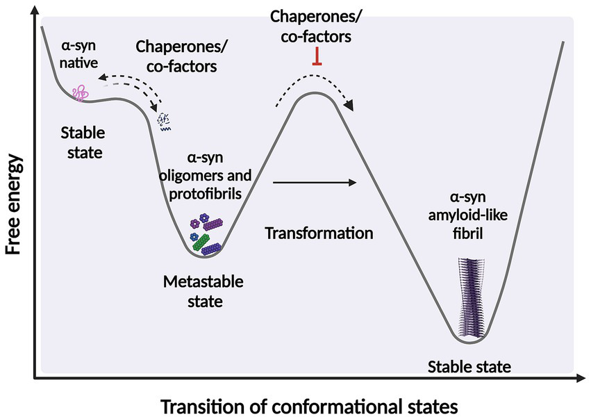 Scheme representing the structural transition during protein-folding. Under certain circumstances, intermediate structural conformation can escape from native folding and become kinetically trapped. These intermediate conformations require overcome an energy barrier to achieve a favorable downhill path to form highly ordered stable of species. α-syn protein transformations can be accelerated by factors and co-factors, such as posttranslational modifications (PTM) and chaperone by adding energy to significantly reduce the kinetic barrier. Fibrillary aggregation can be triggered after destabilization of the native state (partially folded states) which can also be prevented or reversed by molecular chaperones. Created with BioRender.com.
