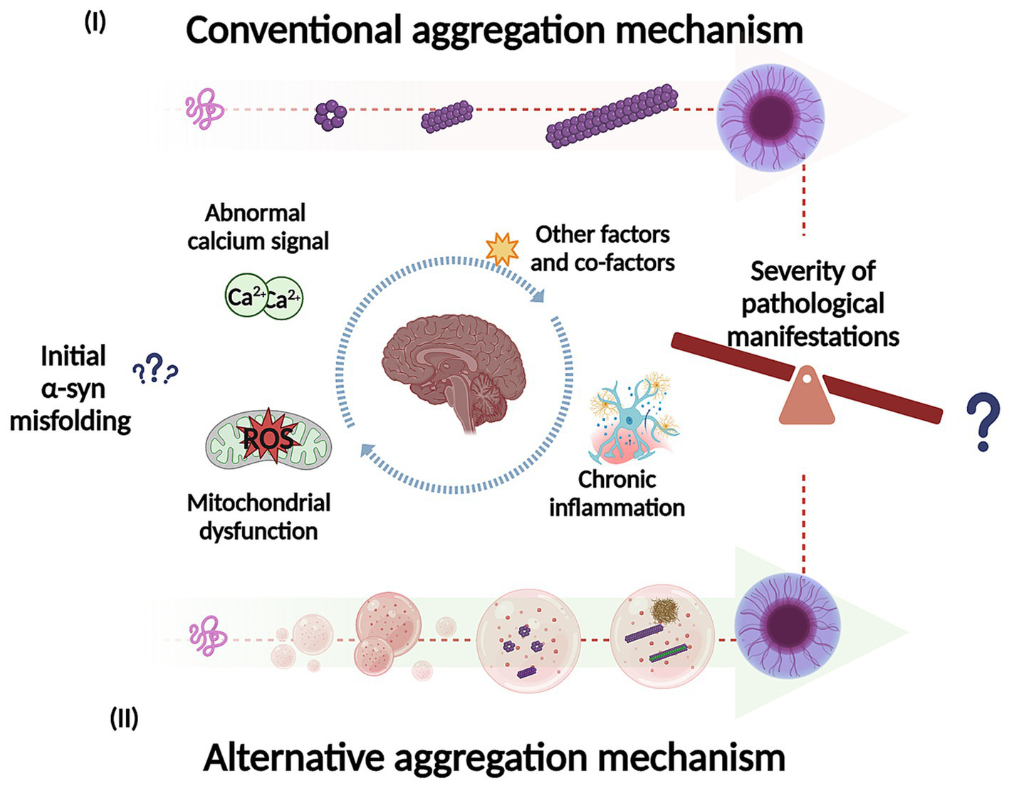 Representation of potential mechanisms for α-syn self-assembly and aggregation into intermediate species, fibrils and inclusions. In the conventional aggregation mechanism (I), monomers could self-assemble into dimers and then progressively into different oligomeric species on pathway to further form filaments, fibrils, and inclusions. In addition, the alternative aggregation mechanism (II), α-syn could undergo liquid–liquid phase separation (LLPS) to form droplets and transition to liquid-to-solid phase, which could potentially undergo gel-like structure (hydrogel) with embedded oligomers and filaments. The LLPS and condensate formation could potentially be key to understand what trigger α-syn misfolding and conformational changes (influenced by environmental conditions). In addition, this process may play an important role in the pathological manifestations as well in its severity. Created with BioRender.com
