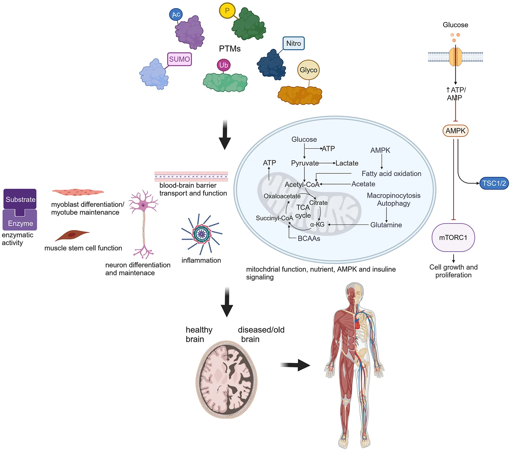 PTMs are crucial for biological processes contributing to healthy organ function. Protein post-translational modifications (PTMs), such as phosphorylation (P), acetylation (Ac), SUMOylation (SUMO), S-nitrosylation (Nitro), ubiquitination (Ub) and glycosylation (Glyco), affect a wide range of cellular and biological functions as depicted in this cartoon. Perturbations lead to severe consequences for the normal function of the brain and other organs, such as muscle. Created in BioRender. Hübner (2024) BioRender.com/j49w898.