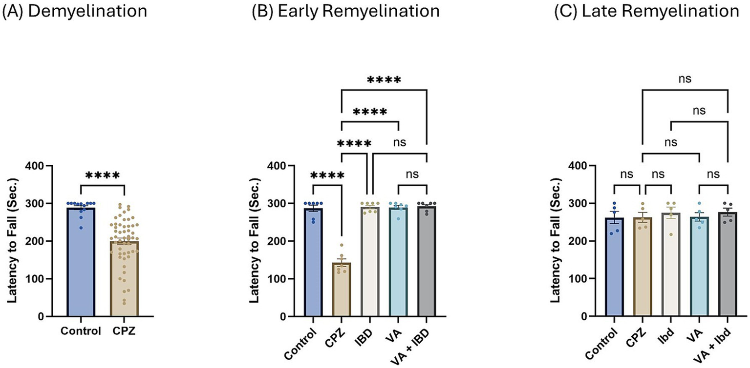 Latency to fall measured using Rotarod test. (A) Latency to fall in week 5 of demyelination measured in control and CPZ group. (B) Latency to fall of control, CPZ, IBD, VA, and VA + IBD measured in week 7 of early remyelination. (C) Latency to fall of control, CPZ, IBD, VA, and VA + IBD measured in week 9 at late remyelination. Data in (A) was analyzed by unpaired two-tailed t test. Data in (B,C) was analyzed using one-way ANOVA followed by Tukey’s multiple comparisons test. Data was presented as mean ± SEM, and p < 0.05 was considered significantly different. ns, non-significant; *p < 0.05, and ****p < 0.0001. Sec., second.