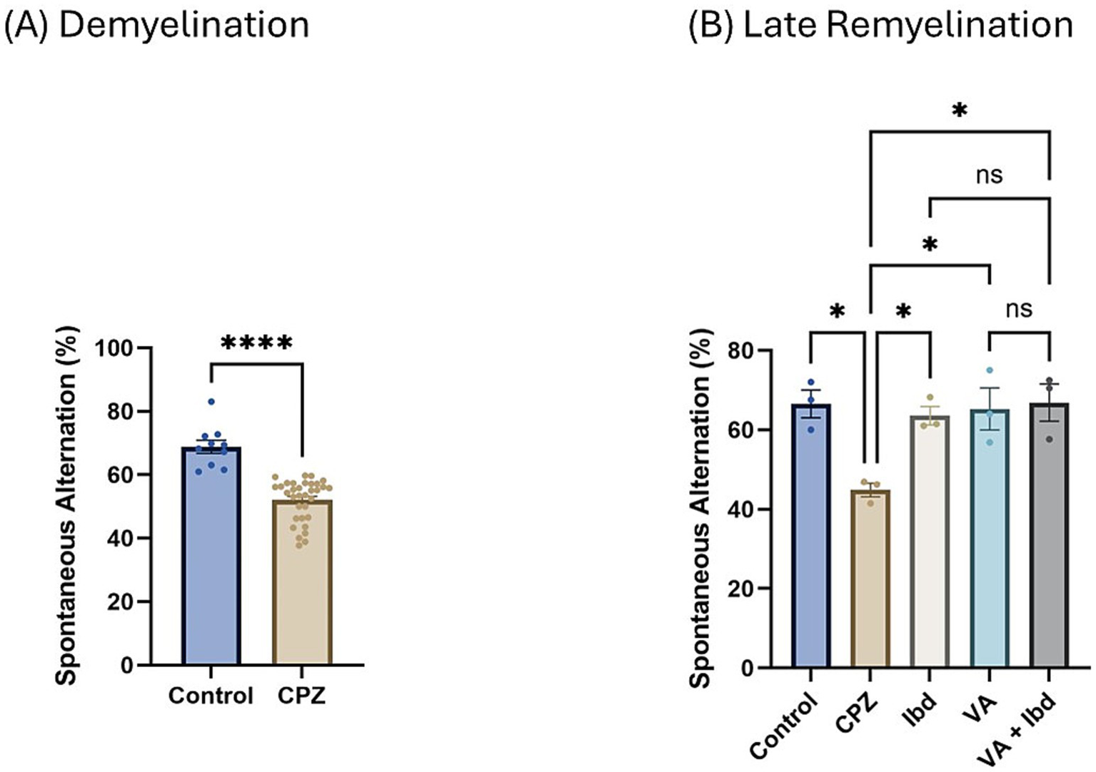 Percentage (%) of spontaneous alteration in Y-maze. (A) % of spontaneous alteration was calculated in control and CPZ group at week 5 of demyelination and analyzed by unpaired two-tailed t test. (B) % of spontaneous alteration at last week (W 9) of late remyelination shown in control, CPZ, IBD, VA, and VA + IBD. (B) Was analyzed using one-way ANOVA followed by Tukey’s multiple comparisons test. Data was presented as mean ± SEM, and p < 0.05 was considered significantly different. ns, non-significant; *p < 0.05, and ****p < 0.0001. %, percentage.