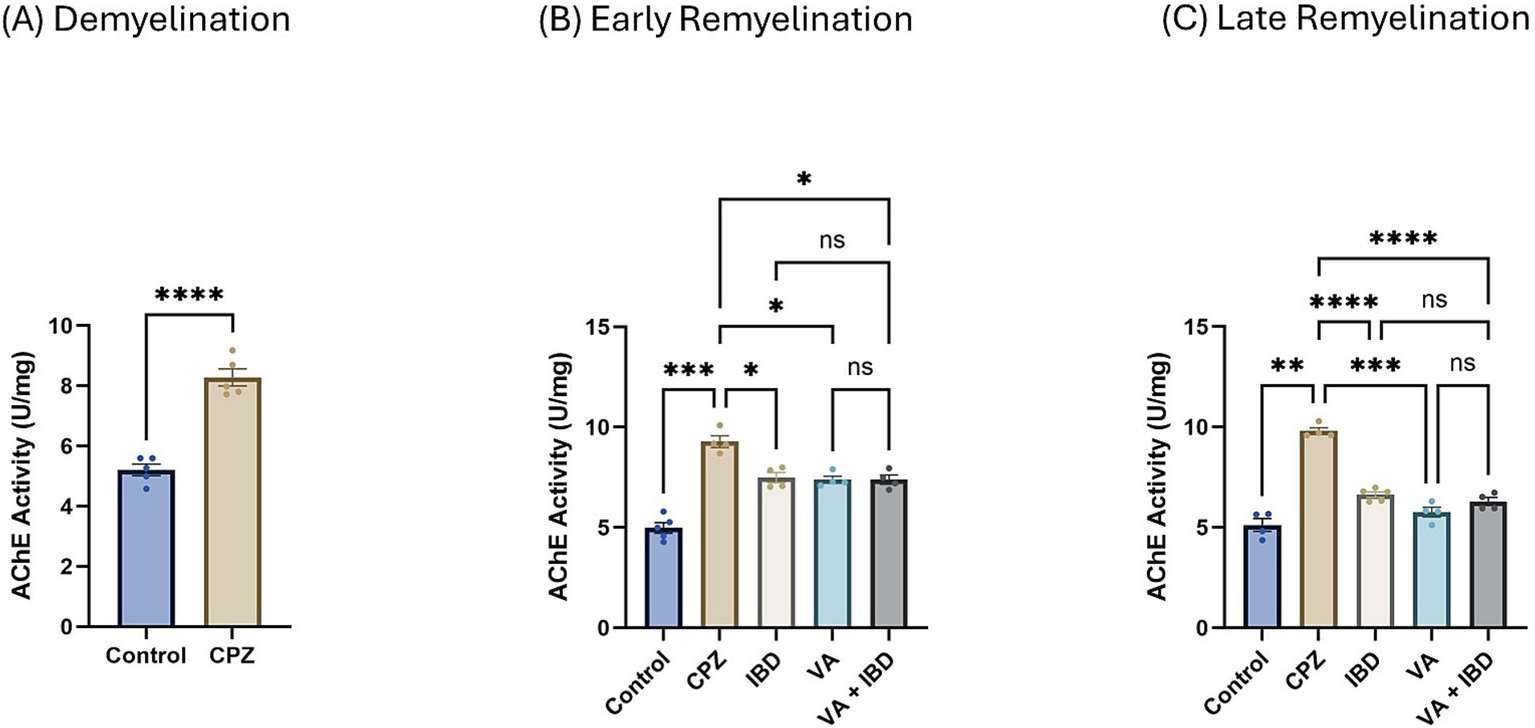Acetylcholinesterase activity. (A) Acetylcholinesterase activity in week 5 of demyelination measured in Control and CPZ group. (B) Acetylcholinesterase Activity of Control, CPZ, IBD, VA, and VA + IBD measured in week 7 of early remyelination. (C) Acetylcholinesterase Activity of Control, CPZ, IBD, VA, and VA + IBD measured in week 9 at late remyelination. Data in (A) was analyzed by unpaired two-tailed t test. Data in (B,C) was analyzed using one-way ANOVA followed by Tukey’s multiple comparisons test. Data was presented as mean ± SEM, and p < 0.05 was considered significantly different. ns, non-significant; *p < 0.05, **p < 0.01, ***p < 0.001, and ****p < 0.0001. AChE, Acetylcholinesterase; U, unit; mg, milligram.