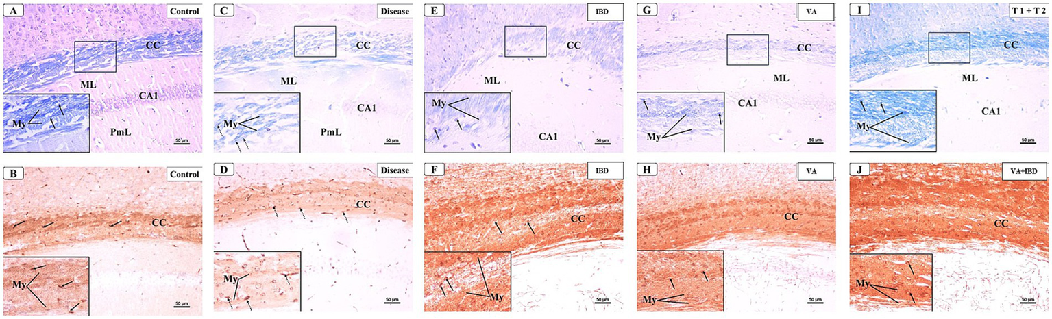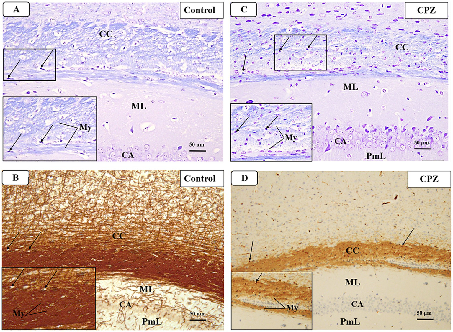 Representative photomicrographs of the corpus callosum (CC) at demyelination. (A,B) The Control group showed a typical blue staining intensity and a tightly packed arrangement of myelinated fibers in the corpus callosum (CC). Inset shows regularly dispersed myelinated nerve fibers (My) and oligodendrocytes (arrows). The myelinated nerve fibers are highly defined, darkly pigmented, and are positioned in between the nerve fibers. There is a strong positive reactivity of myelin basic protein in both the myelin fibers (My) and oligodendrocytes (arrows). (C,D) The CPZ group exhibited a minor reduction in staining intensity in the previously mentioned areas compared to the control group. The observed findings include a reduction and disorganization in the myelinated nerve fibers (My) and a decrease of oligodendrocytes size (arrows). There is a weak reaction to myelin basic protein of myelin fibers (My) and oligodendrocytes (arrows).