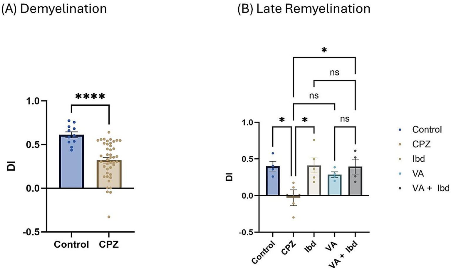 Novel Object Recognition Test (NORT) expressed as Discrimination Index (DI). (A) DI measured in week 5 of demyelination in control and CPZ using unpaired two-tailed t test. (B) DI measured in week 9 of late remyelination in control, CPZ, IBD, VA, and VA + IBD using one-way ANOVA followed by Tukey’s multiple comparisons test. Data was presented as mean ± SEM, and p < 0.05 was considered significantly different. ns, non-significant; *p < 0.05, and ****p < 0.0001. NORT, Novel Object Recognition Test; DI, Discrimination Index.