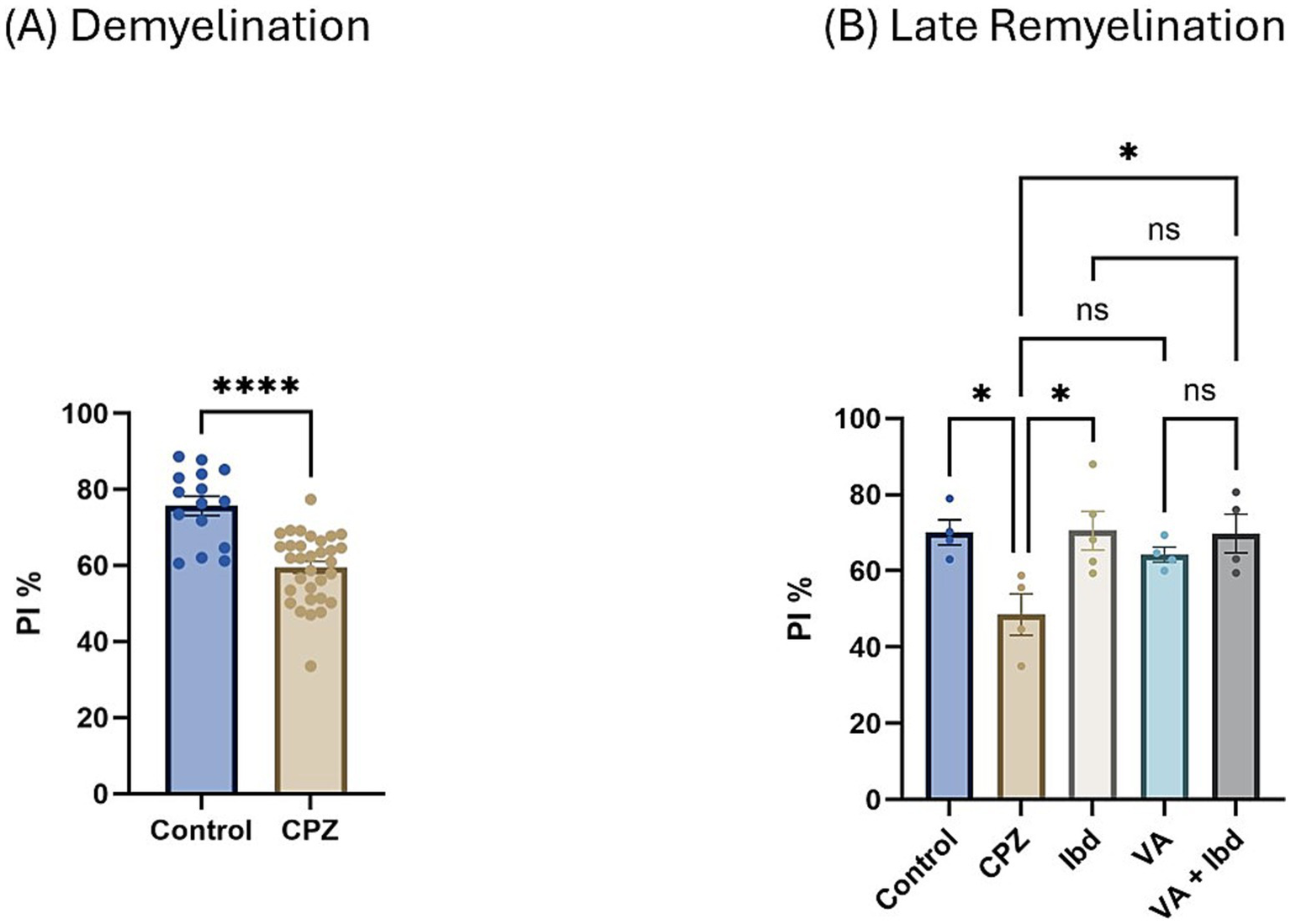 Novel Object Recognition Test (NORT) expressed as Preference Index percentage (PI %). (A) PI % measured in week 5 of demyelination in control and CPZ using unpaired two-tailed t test. (B) PI % measured in week 9 of late remyelination in control, CPZ, IBD, VA, and VA + IBD using one-way ANOVA followed by Tukey’s multiple comparisons test. Data was presented as mean ± SEM, and p < 0.05 was considered significantly different. ns, non-significant; *p < 0.05, and ****p < 0.0001. NORT, Novel Object Recognition Test; PI, Preference Index; %, percentage.