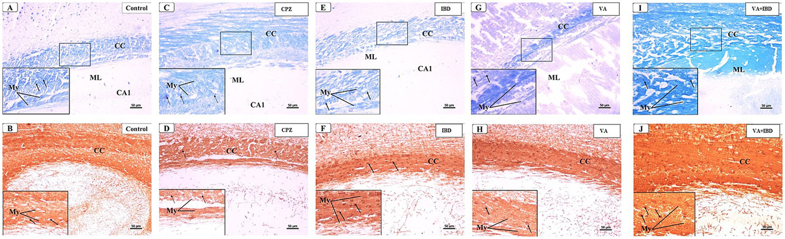 SWR/J male mice were divided into two main groups: the control group (20%) and the CPZ group (80% mice). To induce demyelination, the CPZ group was fed 0.3% mixed rodent chow for 5 consecutive weeks, whereas the control group received normal rodent chow during the same period. Following this, the remaining mice in the CPZ group were further subdivided into four equal groups (20% mice/ each): the CPZ (disease model) group, the IBD-treated group, the VA-treated group, and the VA + IBD combination-treated group. The control group was also included during the treatment phase (Supplementary Figure S4).