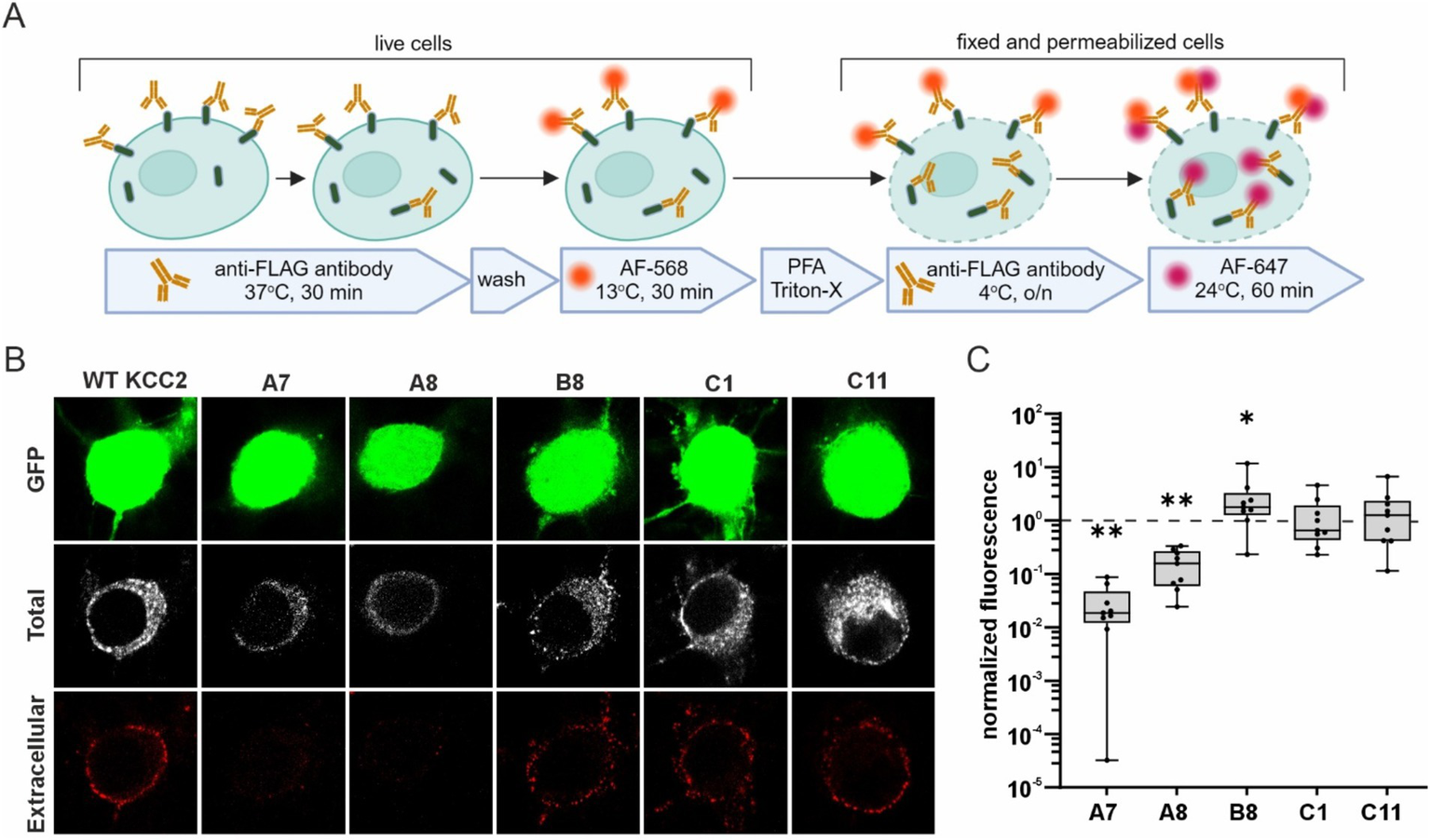 To test whether the glycosylation patterns observed in HEK293 cells correlate with the abundance of the KCC2-CTD mutants in the neuronal plasma membrane, we analyzed their membrane expression in dissociated cortical cultures. We selected mutants representing all three glycosylation groups: A7 and A8 (immature glycosylation and no Cl− extrusion activity), B8 and C1 (mature glycosylation and high Cl− extrusion activity), and C11 (intermediate glycosylation and no Cl− extrusion activity). To visualize KCC2 expression at the neuronal plasma membrane, cortical cultures were transfected with the corresponding KCC2 expression constructs, and FLAG-ir was assessed using live-cell surface immunolabeling protocol (Chamma et al., 2013; Friedel et al., 2017). This protocol consists of two steps (Figure 5A): first, revealing FLAG-tags of the KCC2 molecules present in the plasma membrane of non-permeabilized living cells (“Extracellular” in Figure 5B; and second, detecting FLAG-tags in KCC2 molecules in both the plasma membrane and intracellular compartments of permeabilized PFA-fixed cells “Total” in Figure 5B). The ratio of the two signals serves as a measure of the KCC2 plasmalemmal abundance.