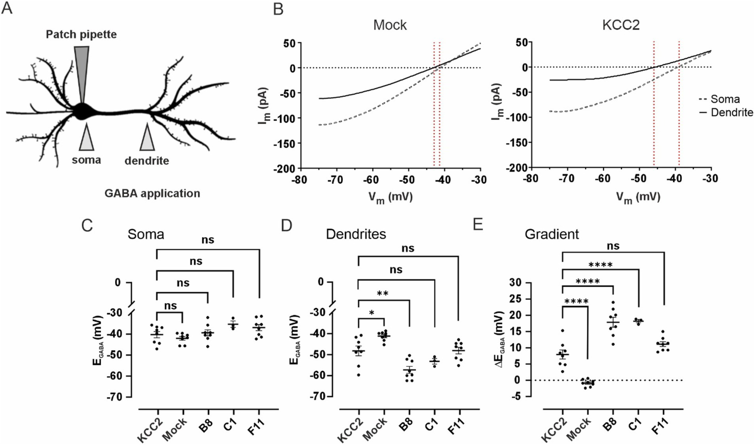 (A) Schematic drawing illustrating of the experimental setup for assessing changes in dendritic chloride extrusion. GABA was locally applied at the soma and at the primary dendrite of a transfected neuron recorded in whole-cell voltage clamp mode with a pipette containing 30 mM of Cl−. (B) Mean voltage ramp trace during local application of GABA at the soma (black dashed line) and the dendrite (black solid line) for Mock- (left panel) and KCC2- (right panel) transfected neurons. Red dashed lines mark an estimation of the GABAA reversal potential at the specific location. (C) EGABA values at the soma of neurons transfected with pcDNA3 (Mock), KCC2, and the CTD mutants. Dots represent individual experiments, the horizontal line is drawn at the mean, error bars are SEM. ANOVA with Bonferroni post-hoc test, *p < 0.05, **p < 0.01, ***p < 0.001, ****p < 0.0001, ns – not significant. (D) EGABA values at the dendrite of neurons transfected with pcDNA3 (Mock), KCC2, and the CTD mutants. The data presentation and statistical tests are the same as in (C). (E) Somatodendritic EGABA gradient (ΔEGABA) in neurons transfected with pcDNA3 (Mock), KCC2, and the CTD mutants. The data presentation and statistical tests are the same as in (C).