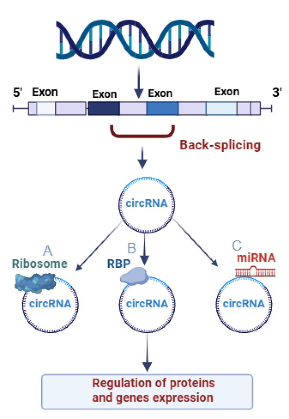 Function of three differently generated Circular RNAs (circRNAs). (A) CircRNAs which participate in protein translation, modifying the transcription, and protein-coding function. (B) CircRNAs attached to RNA binding proteins. (C) CircRNAs participate in controlling the activity of miRNA-by-miRNA sponge's function.